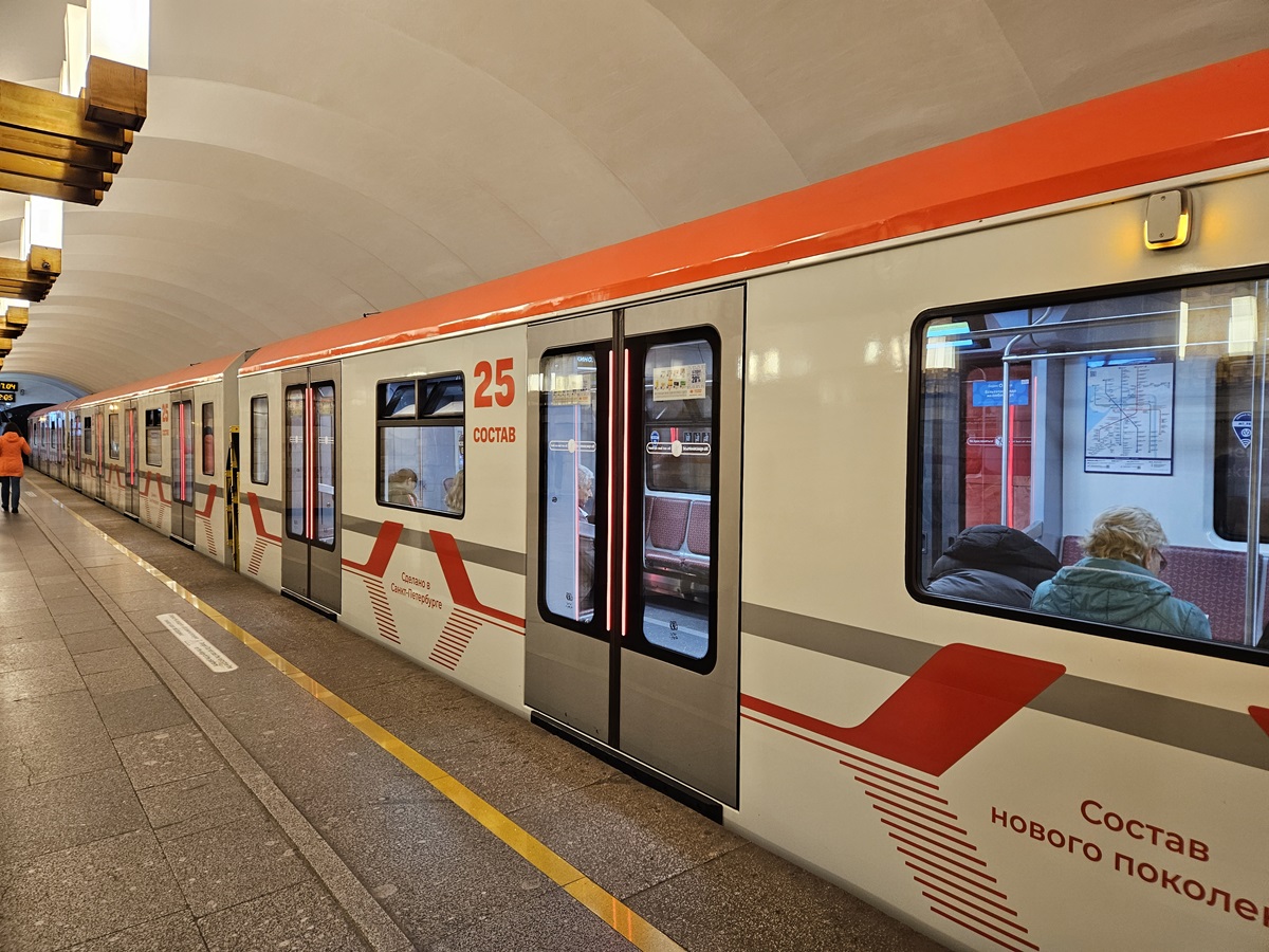 разукрашенный снаружи надписями: "Сделано в Санкт-Петербурге, 25 состав"
