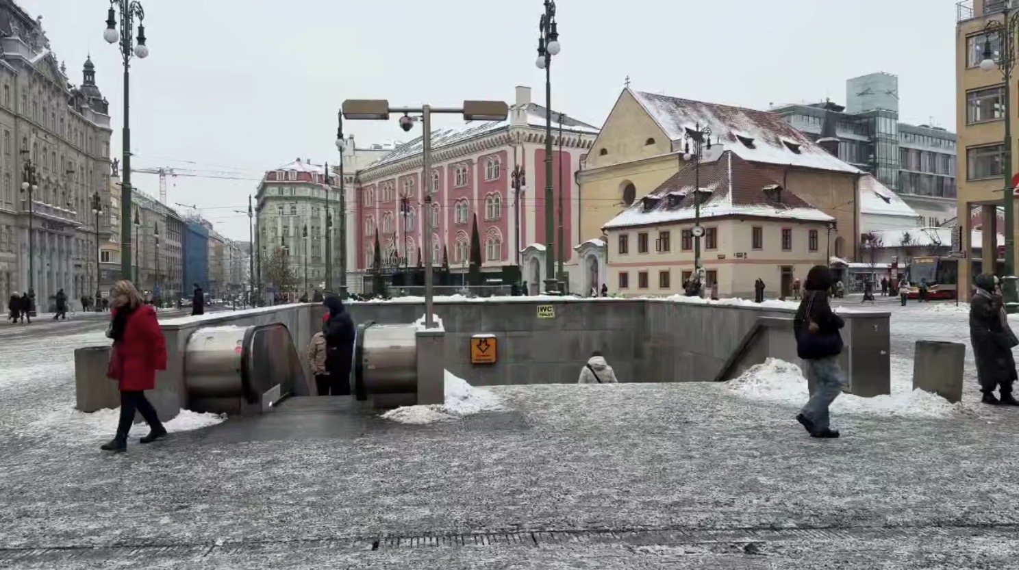 В Праге у меня была короткая пересадка, но я как раз попал на последствия снегопада. Прага и так прекрасна, а со снегом — тем более, но нас интересуют вестибюли метро. Напомню: здесь классическое советское метро, аналогичное петербургскому, будапештскому или варшавскому. Но разница кроется в деталях.