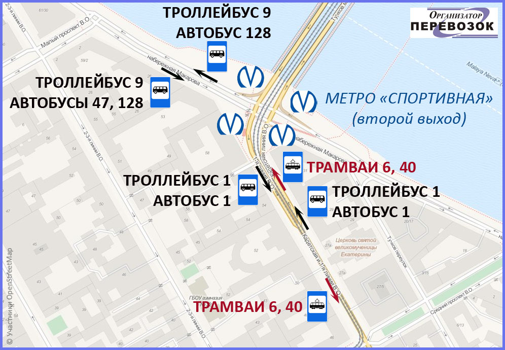 - остановка автобуса № 1 и троллейбуса № 1, а также остановка трамваев №№ 6, 40 на 1-й и Кадетской линиях перед перекрёстком с набережной Макарова с названием "1-я и Кадетская линии. Станция метро "Спортивная".