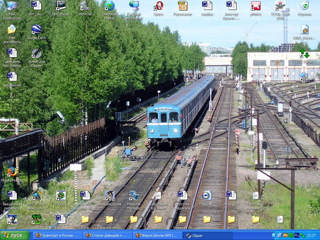 У меня вот на рабочем столе за последний год были только фотки трамов. Дольше всего продержался наверно ЛМ-99АВ №0505, недавно стоял ЛВС-97К №0603, но я опять вернул ЛМ-99АВ №0505. Вообще за всё время бывали всякие разные трамы, но правда дольше месяца они не держались. Была даже кнопка из фильма "Хоттабыч", но она тоже долго не продержалась, т. к. домашние страницы она открывала через Мозиллу, а вот пустое окно (которое стоит у меня как домашняя страница) открывала только через интернет эксплоэр, который я терпеть не могу. К сожалению скрины выложить не могу, чисто из своих соображений.