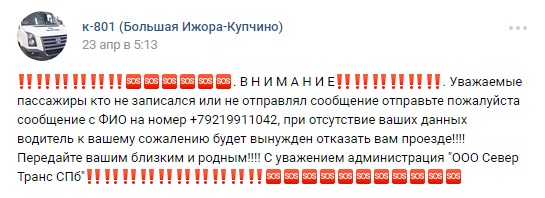 У маршрутки К-801 есть своя группа в «ВК», в которой состоят почти 2,5 тысяч пассажиров. Эта группа для большинства из них — едва ли не единственный способ узнать, удастся ли им завтра доехать на работу из пригорода Петербурга в город. Дело в том, что маршрут, который обслуживало ООО «Север-Транс СПб», отменили. Руководство компании не сдалось, а переделало рейсовый автобус в заказной.