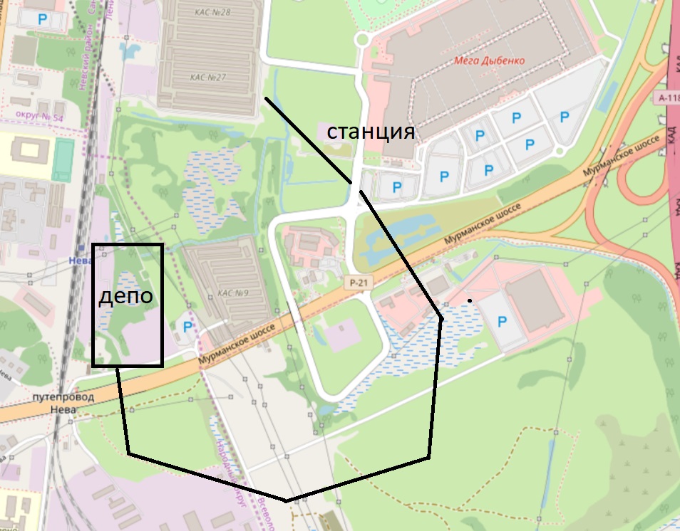 от платформы нева справа есть кусок его надо осушить там место вполне, и это еще Питер. Единственное тоннель надо за Кудрово вправо повернуть, и как бы назад. Примерно так