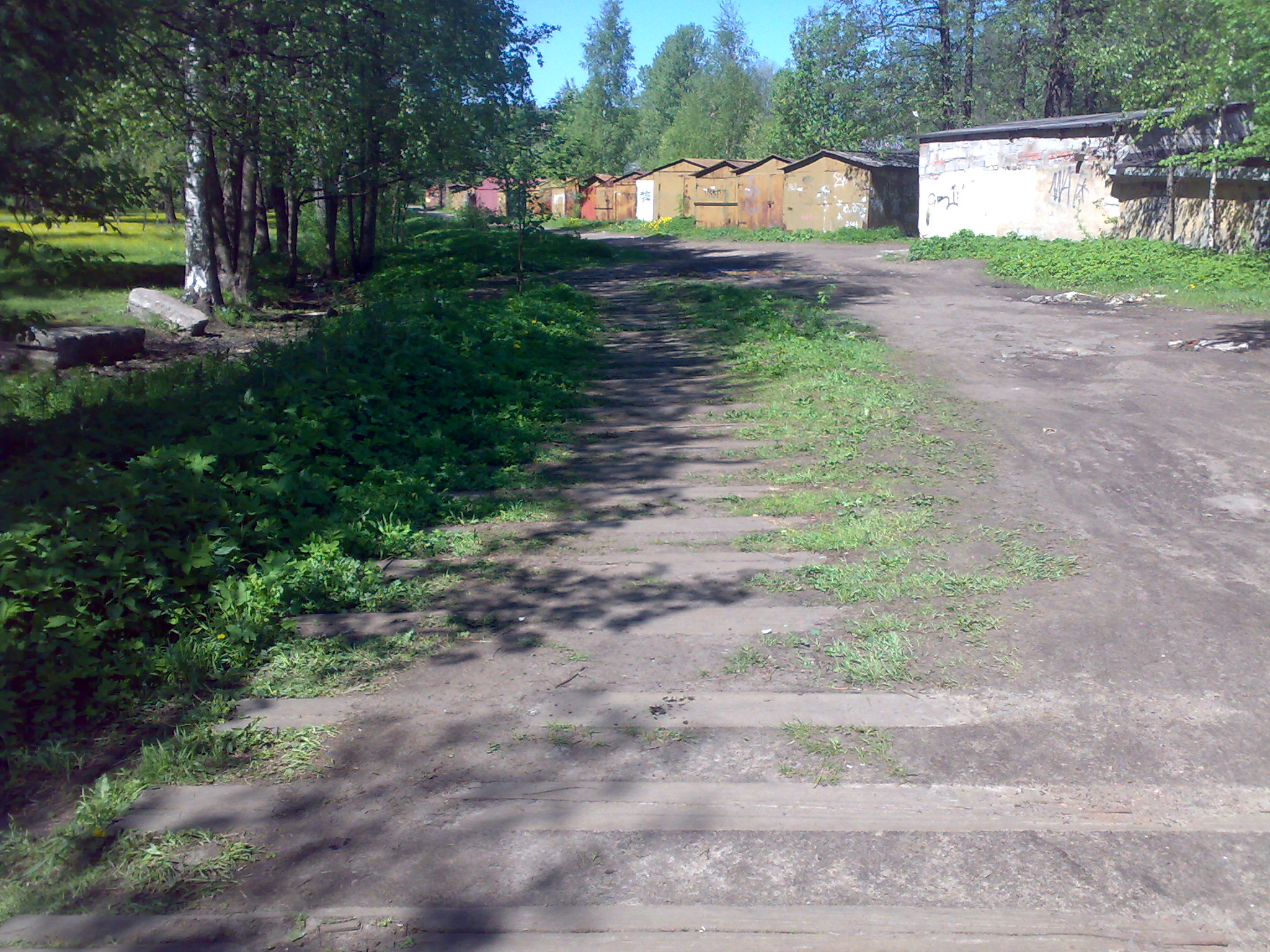 Длинный плавный поворот налево. Все плотно утоптано. Справа гаражи.