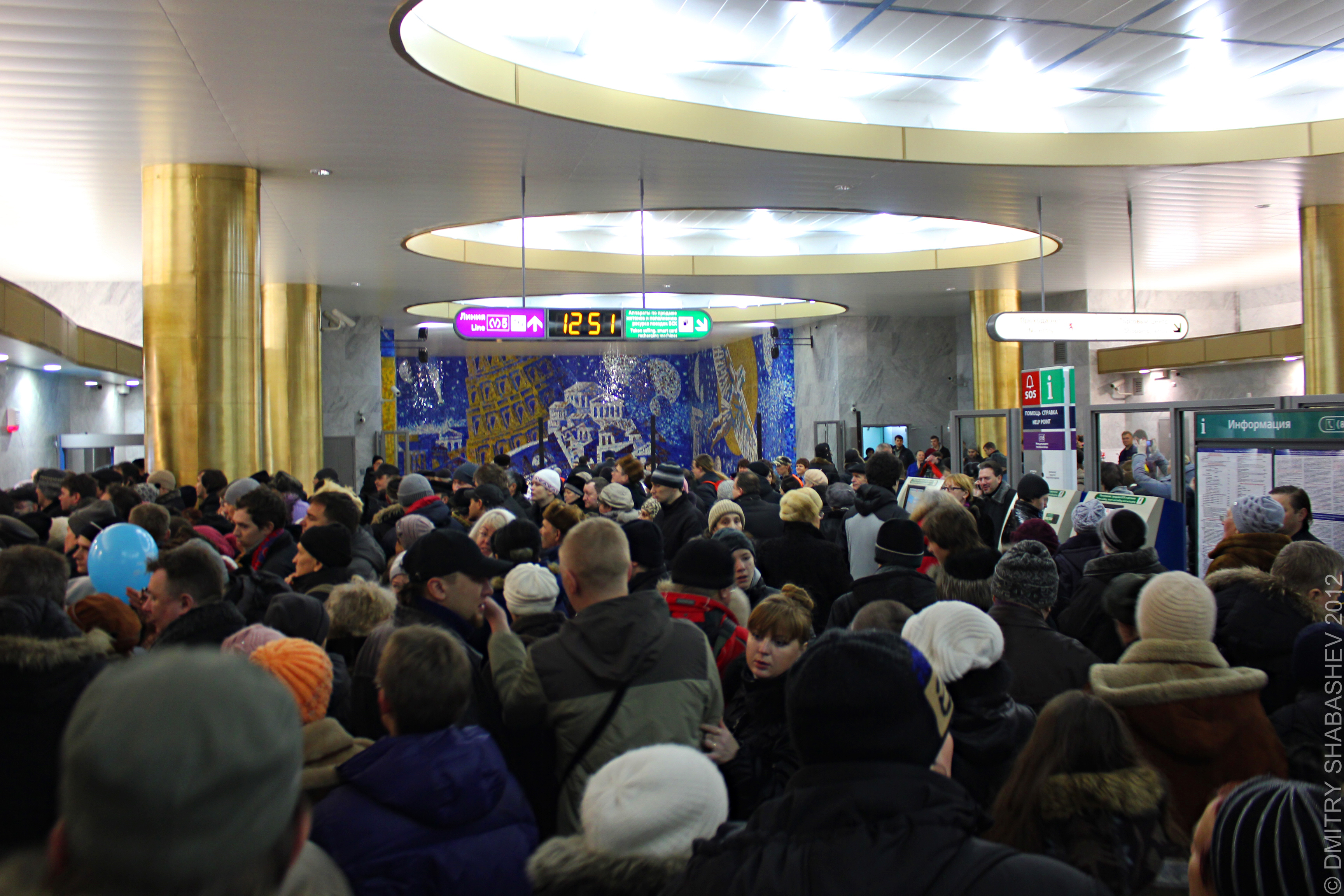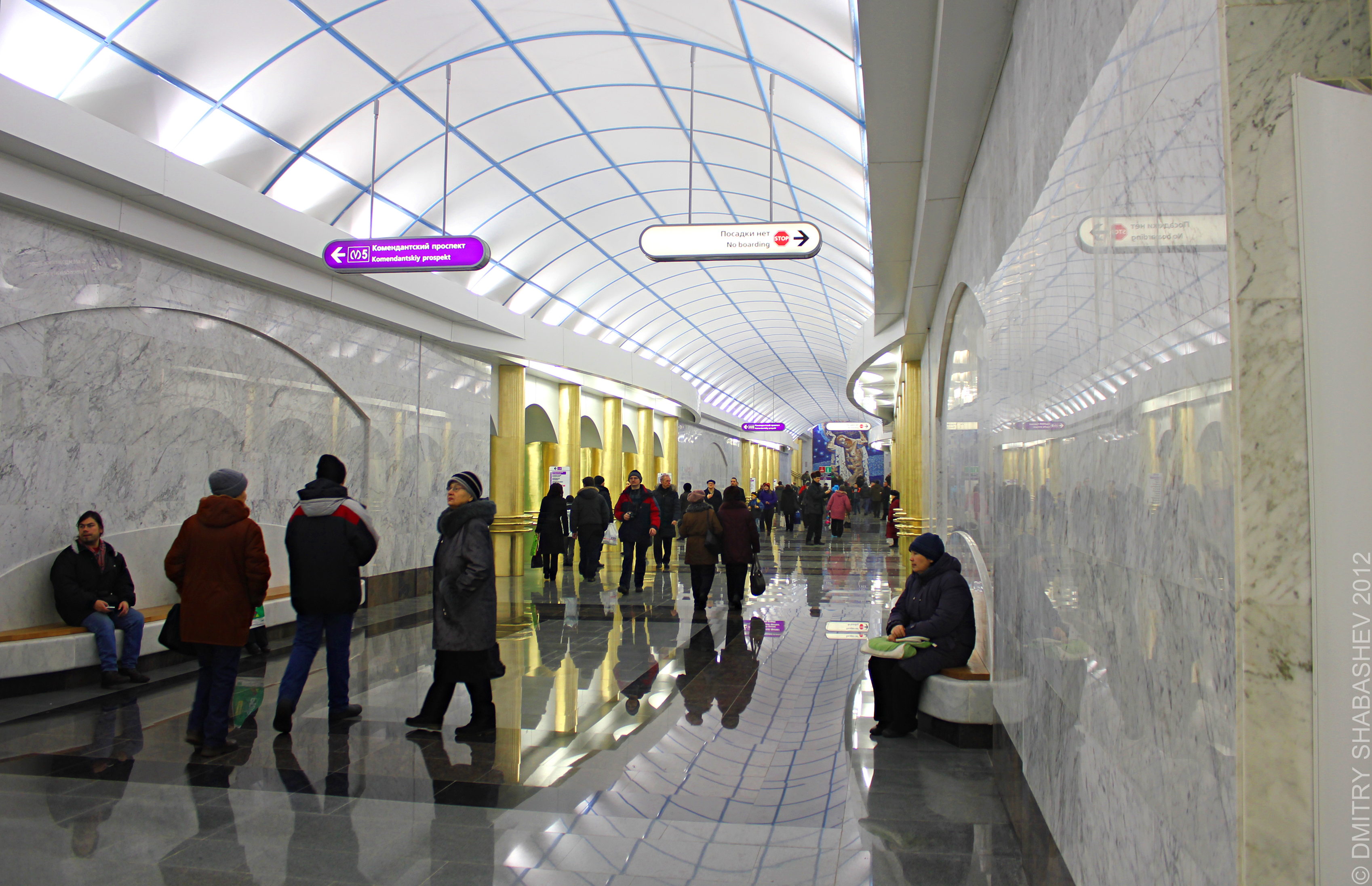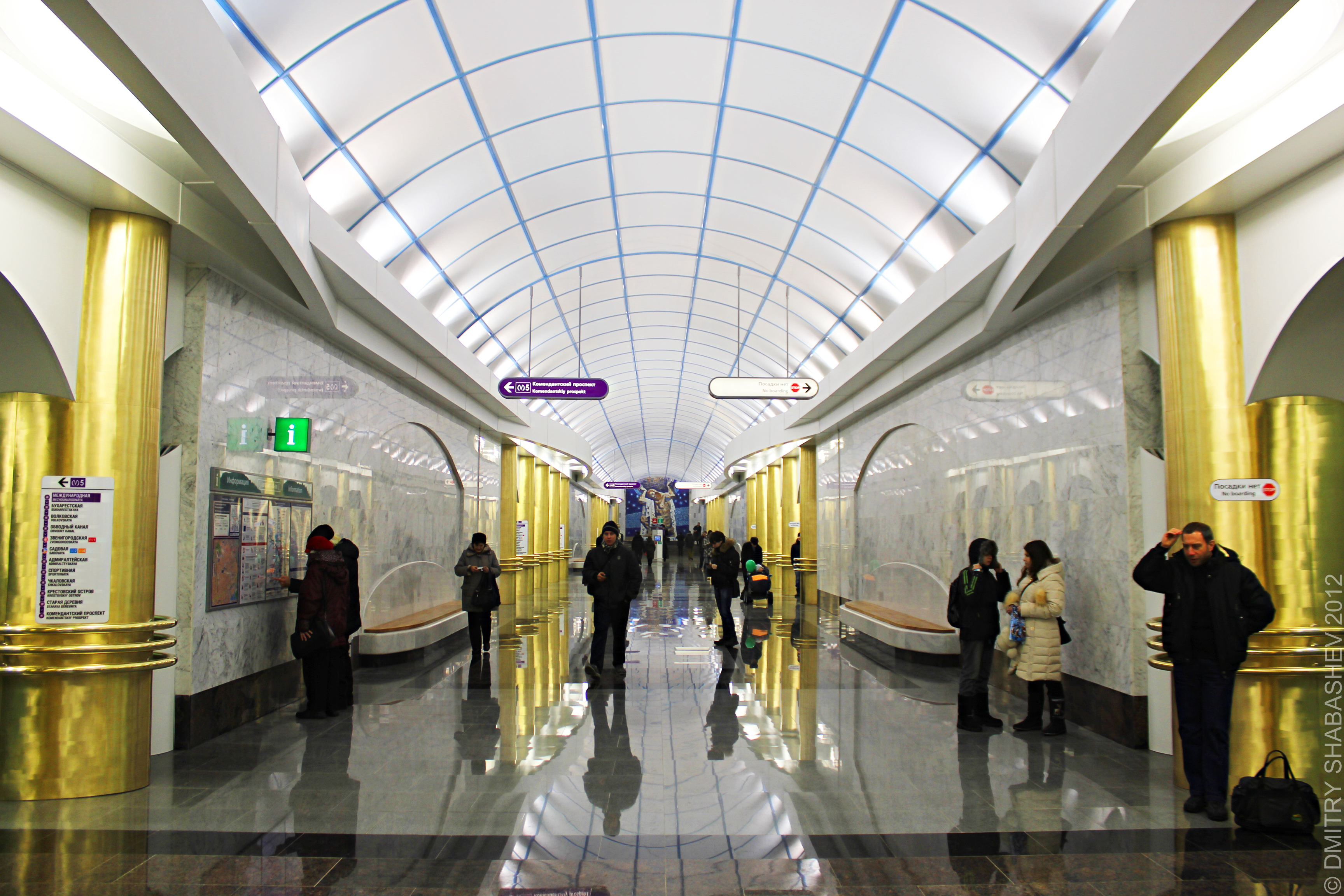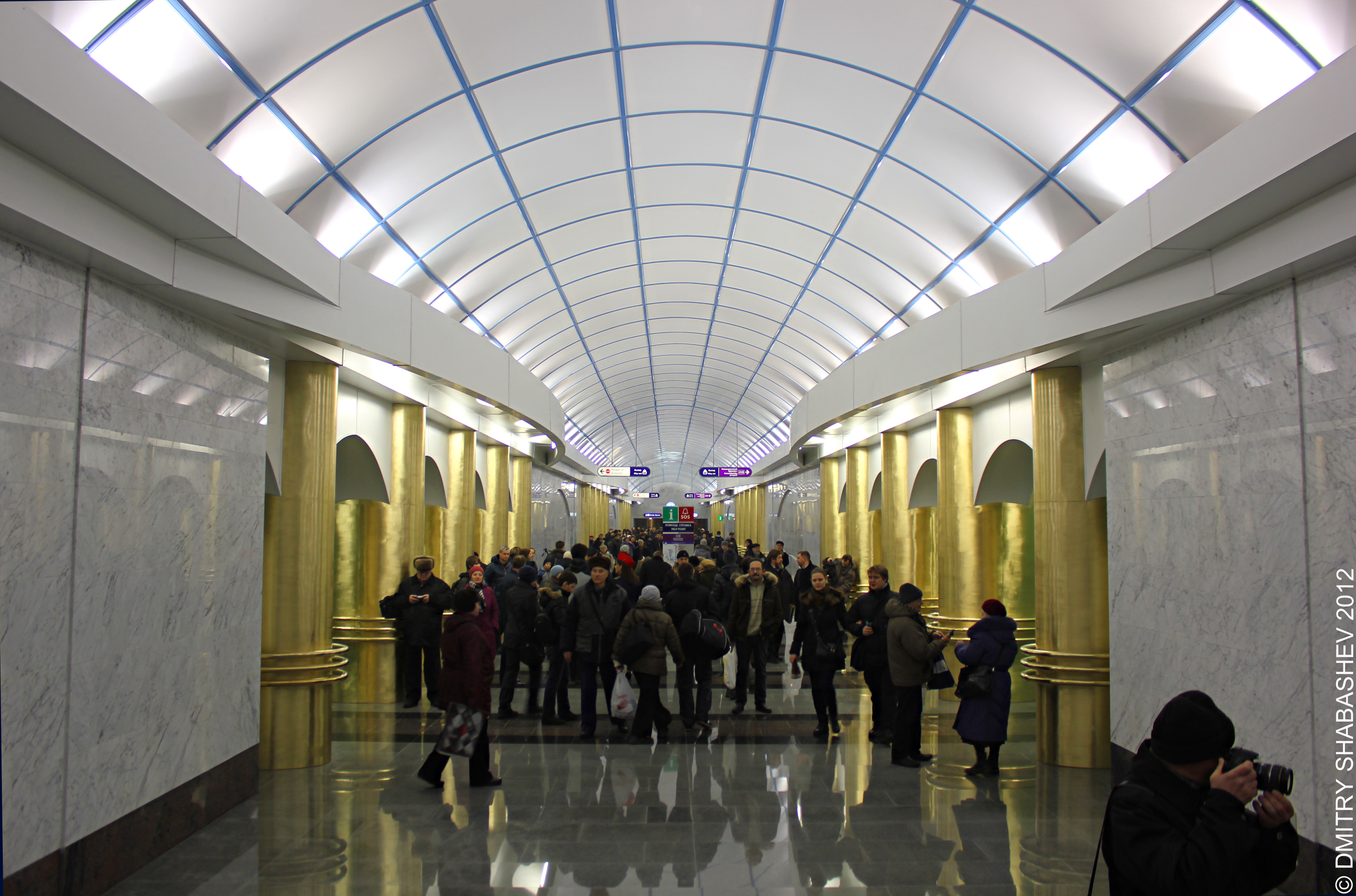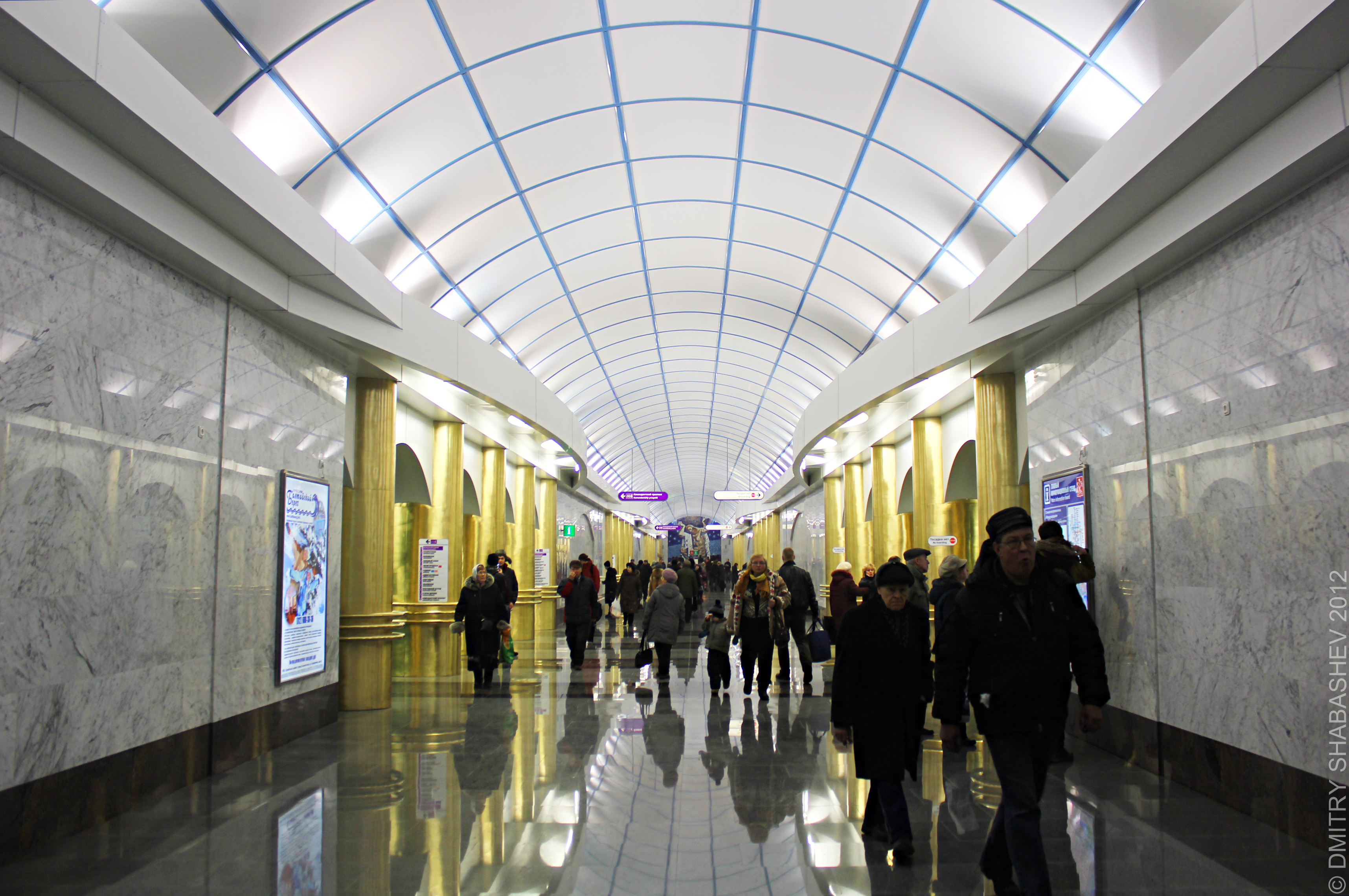 Был на станции рано утром. Даже в 7 утра было много народу в вестибюле (за жетонами что ли стояли) и в вагоны садились. Сложно было поймать кадры без людей. Сама станция откровенно разочаровала, золотые овальные колонны, пластиковый потолок, Атлант с лицом Петра I вертит глобус и ищет где бы прорубить окно в Европу - все это вызывает дисгармонию. В целом станция получилась, но я от нее большего ожидал. Что впрочем, не умаляет её нужность и значимость.