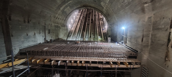 фото 1 и 2: Укладка выравнивающего слоя под финишное покрытие в ССТ (средний тоннель) [над МВУ] и ЛСТ (левая платформа , от её начала до первого проёма.