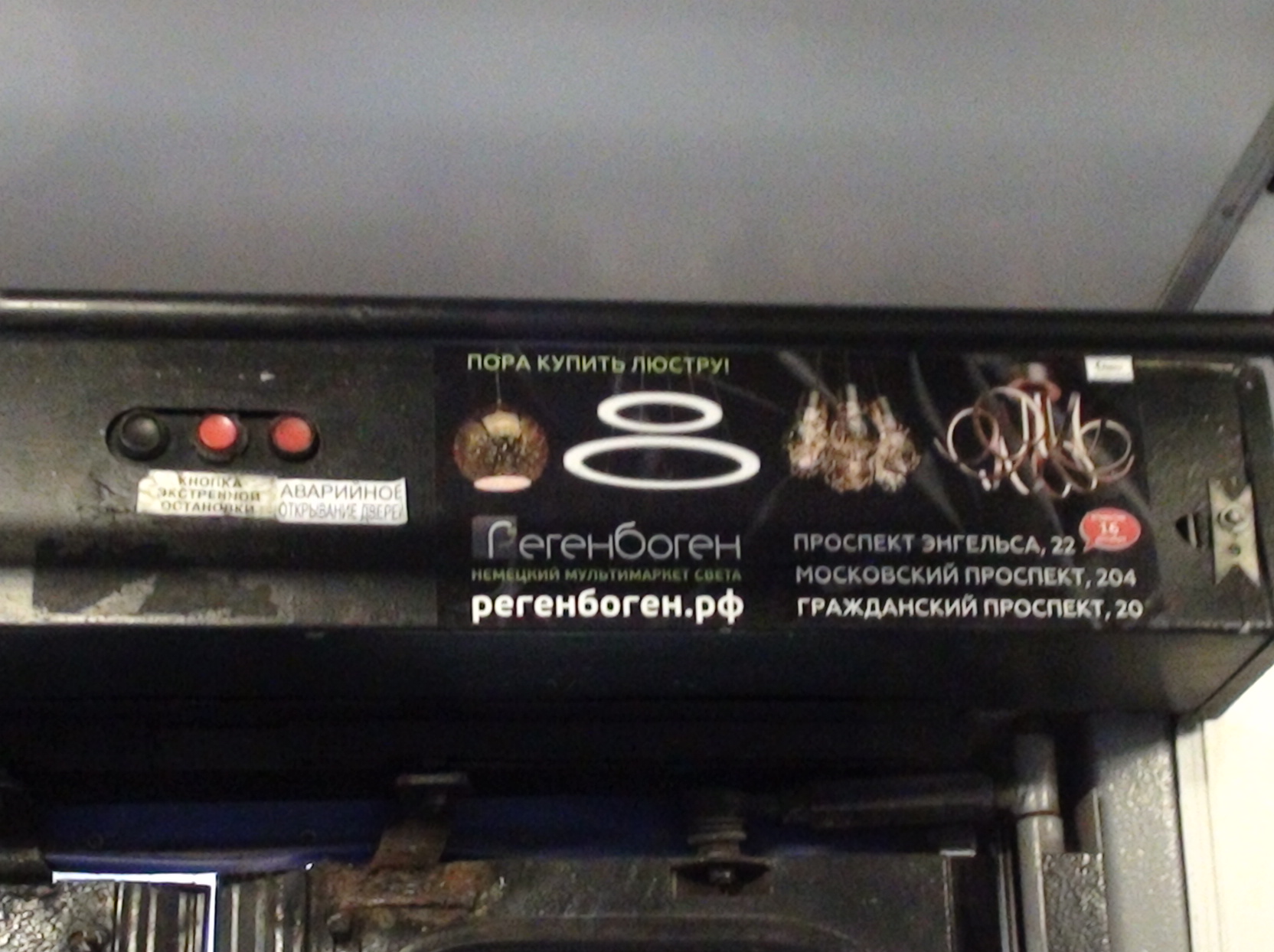В вагонах ПТО "Рыбацкое" такая реклама уже несколько лет. Только там своя (местная). Сейчас, например, магазины "Комус" в Рыбацком и на Дыбенко. Вешается также над дверью, но во всех вагонах. Абсолютно не мешает, кстати. В отличии от тех же перфорированных плёнок на стёклах.