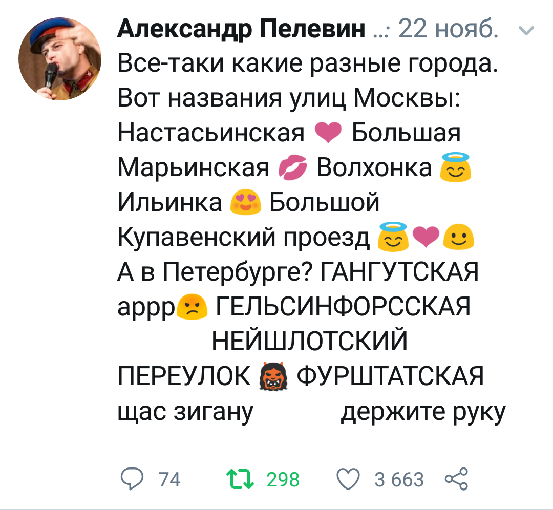 В конце концов, это наша городская история, и наш город отличается от Москвы также, как и в любом другом населенном пункте есть свои особенности, в этом и есть своя прелесть. Замечаю, что периодически встречаются попытки назвать Апраксин двор «апрашкой», Гостиный двор – «гостинкой», площадь Александра Невского – «ПлАНом», «Старая деревня» – «старуха» и т.д., этакая, с виду, небрежность. Но это происходит как раз в молодежной среде, редко среди людей среднего возраста. Признаю, что не говорю, например, «я поеду до площади Александра Невского», тоже сокращаю фразу до «я поеду до Александра Невского», но сказать я поеду до ПлАНа, как-то язык не поворачивается, так же как «встретимся на «старухе», «в апрашке».