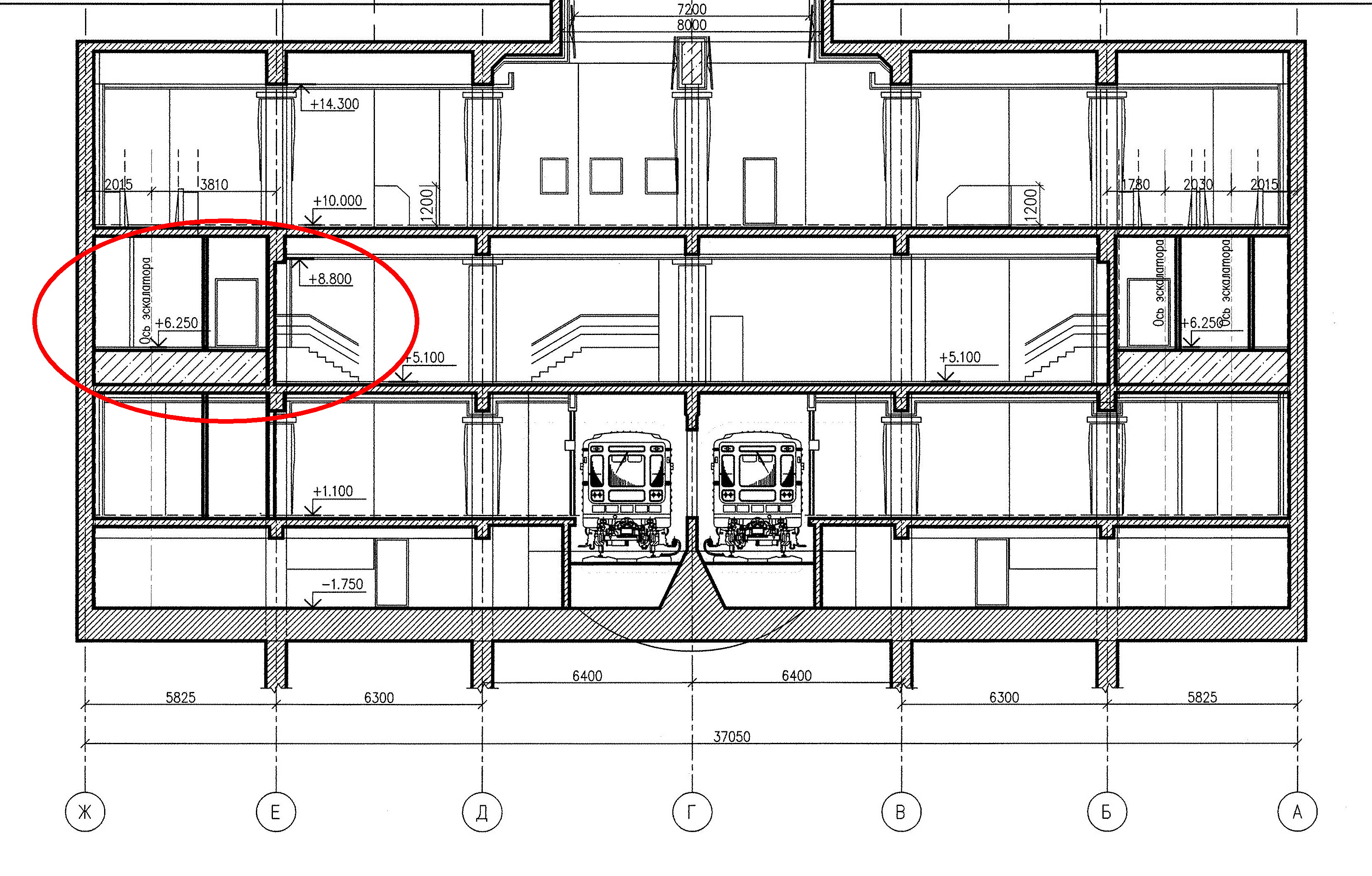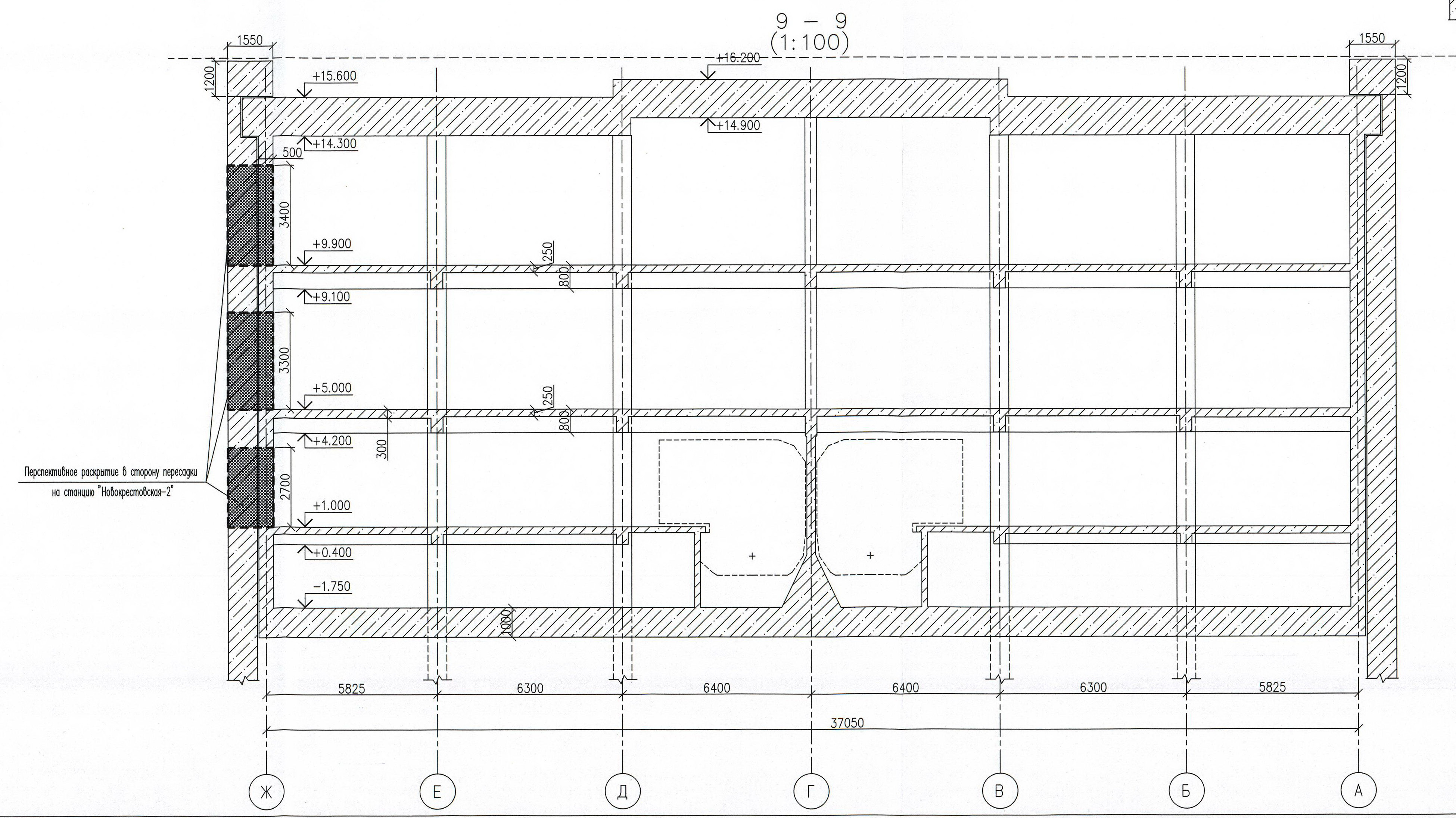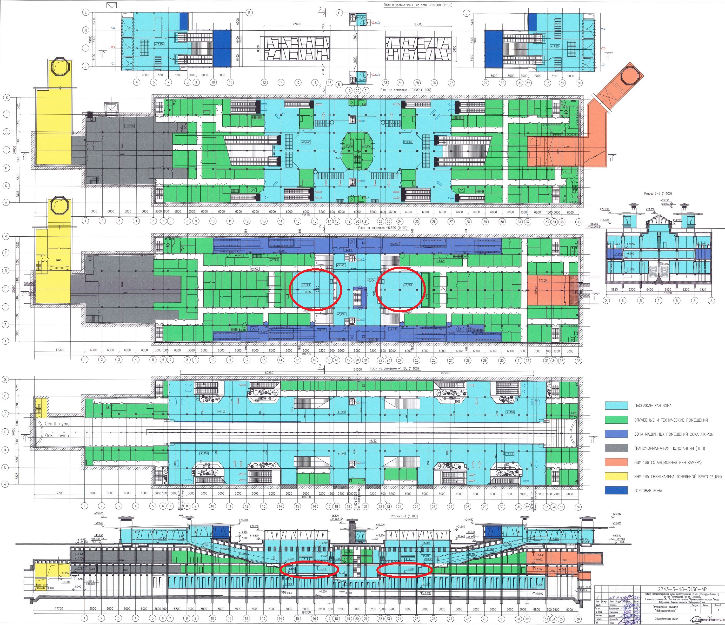 Если мы внимательно посмотрим проектную документацию то увидим, что заделы под пересадочные проёмы есть на всех трёх пассажирских уровнях. С верхним уровнем (кассовый зал) и нижним уровнем (пассажирская платформа) всё понятно. Остаётся вопрос по среднему уровню - переходному мостику. Заделы под проёмы там есть - это видно по чертежу №1. По тому же чертежу видно, что у боковых стен есть возвышения (уровень +6.250) относительно уровня мостика (+5.100) и на этих возвышениях находятся вспомогательные помещения эскалаторной службы и коридоры, соединяющие в одном уровне половинки станции. На каком же уровне находится проём под пересадку? Это видно из чертежа №2 - строительный чертёж перекрытий, сечение по мостику. Проём находится на уровне мостика (+5.000). А как устроено это возвышение у стены? Это видно из чертежа №3. Делая вывод из увиденного - задел под пересадку по переходному мостику есть и он находится на уровне мостика, но на скорое строительство второй станции проектировщики не рассчитывают и поэтому временно разместили на будущем переходе технологические помещения. А когда-нибудь потом (кто его знает когда?) они пойдут под снос.