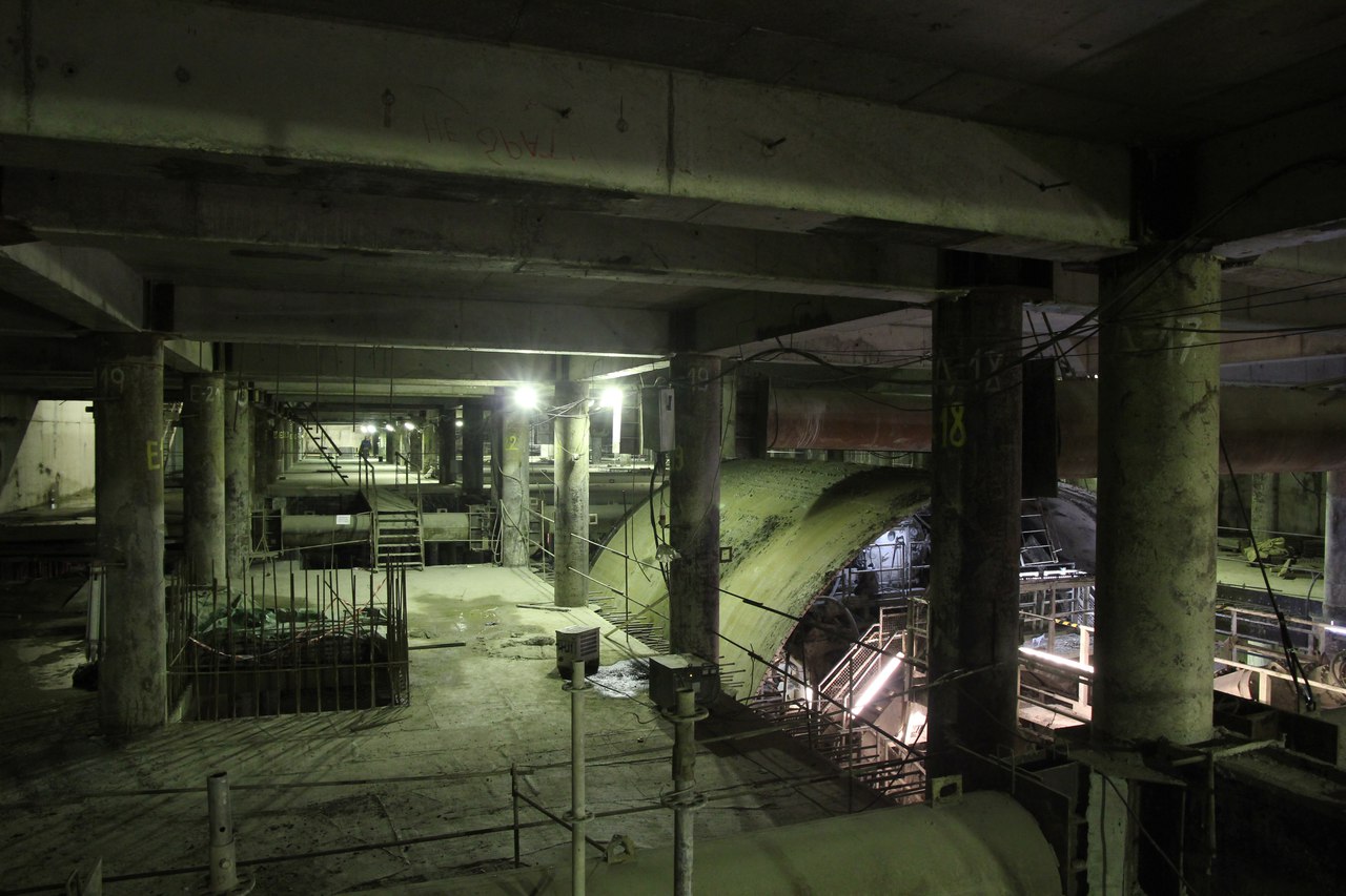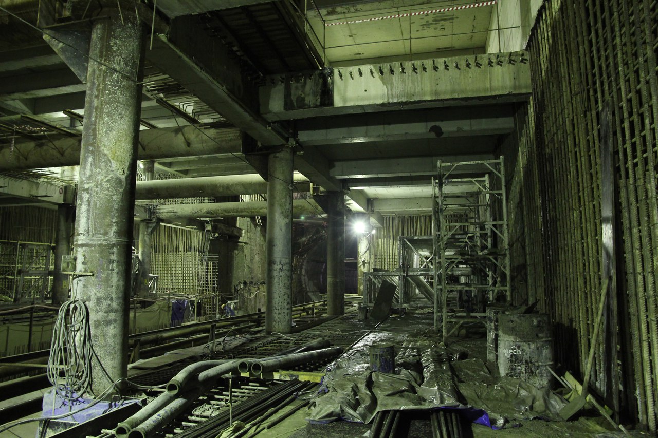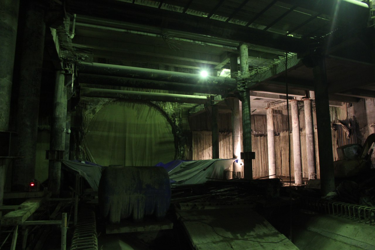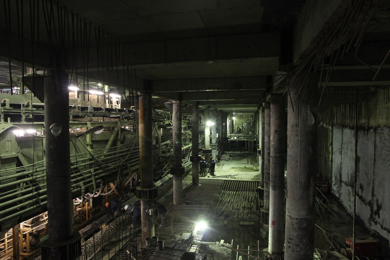 На этот раз от меня большой подробный фотоотчет со станции, снятый не на телефон. На верхнем ярусе перегородки из газобетона растут как грибы после дождя, кассы уже готовы. Лестничные сходы скоро доведут до уровня перекрытия. Ленточный конвейер пока смонтирован до уровня перекрытия +9,900 и выведен на поверхность. На среднем уровне пока никаких изменений, не считая демонтажа расстрелов для прохода ТПМК и возвращения их на прежнее место за щитом. Внизу залиты первые захватки перекрытия платформы, продолжается заливка жесткого основания. В середине станции ведется разработка грунта под зумпф. Последнюю заходку лотка залили совсем недавно, видимо не стали торопиться пока щит встал. Грунт в пространстве между осями А-Б и Е-Ж полностью пока не выбран. Фотографии с ТПМК и с перегонным тоннелем смотрите в теме НВЛ, в один пост все не поместилось