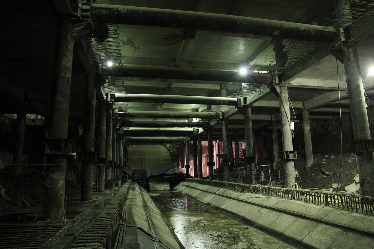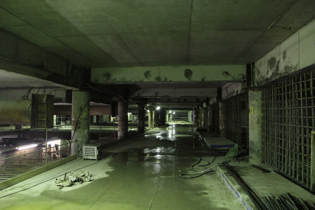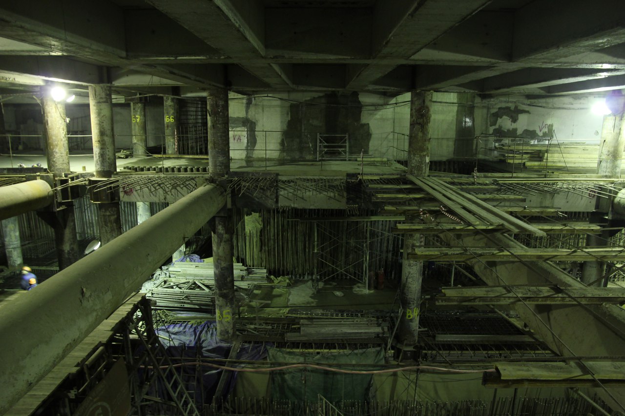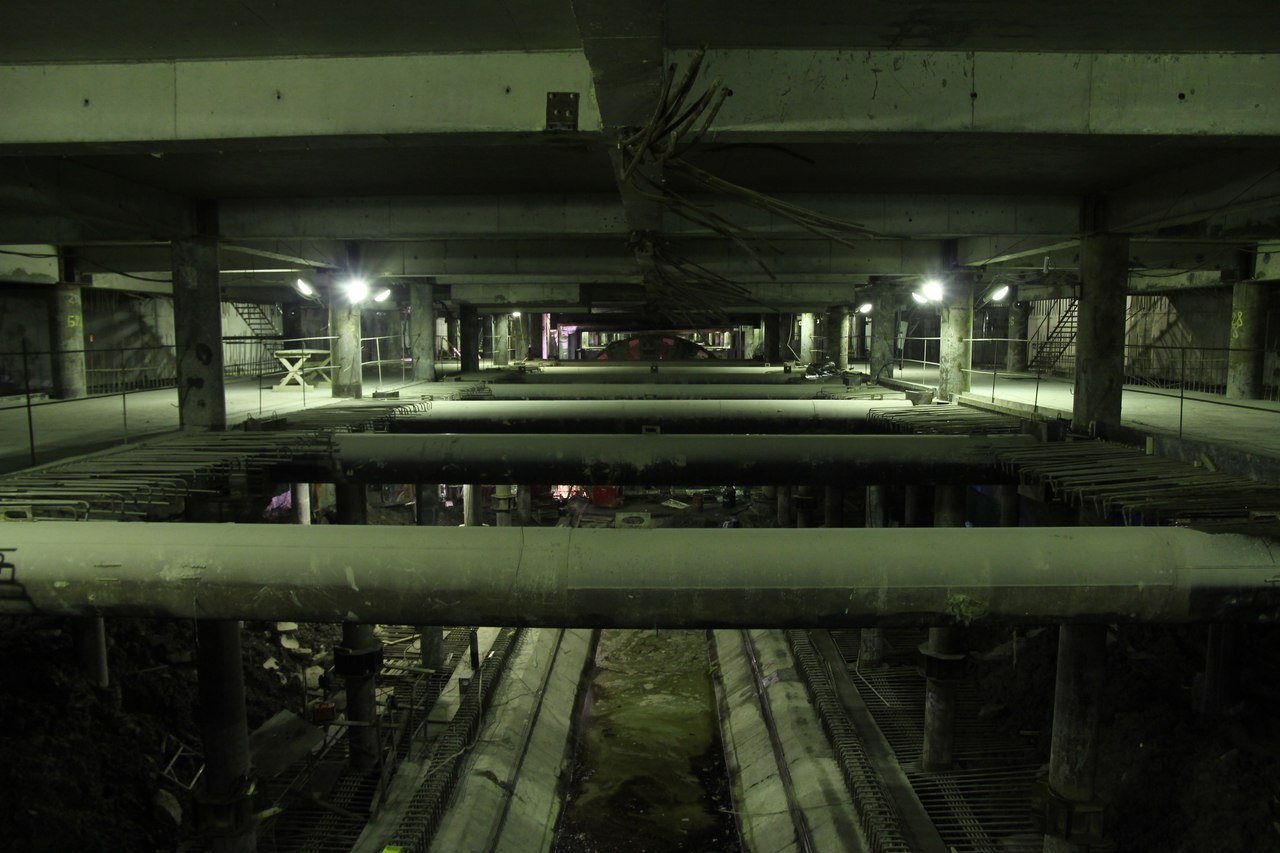 На этот раз от меня большой подробный фотоотчет со станции, снятый не на телефон. На верхнем ярусе перегородки из газобетона растут как грибы после дождя, кассы уже готовы. Лестничные сходы скоро доведут до уровня перекрытия. Ленточный конвейер пока смонтирован до уровня перекрытия +9,900 и выведен на поверхность. На среднем уровне пока никаких изменений, не считая демонтажа расстрелов для прохода ТПМК и возвращения их на прежнее место за щитом. Внизу залиты первые захватки перекрытия платформы, продолжается заливка жесткого основания. В середине станции ведется разработка грунта под зумпф. Последнюю заходку лотка залили совсем недавно, видимо не стали торопиться пока щит встал. Грунт в пространстве между осями А-Б и Е-Ж полностью пока не выбран. Фотографии с ТПМК и с перегонным тоннелем смотрите в теме НВЛ, в один пост все не поместилось