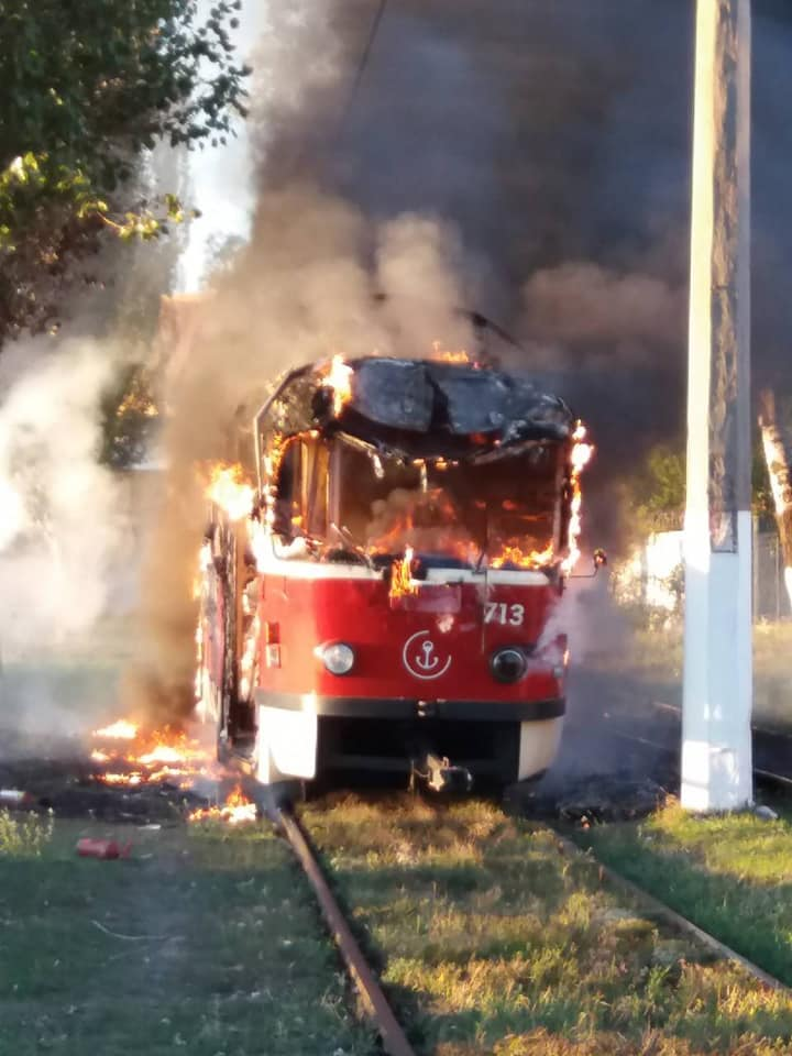 В след за Казанью - Мариуполь. В Мариуполе сгорел трамвай модели Tatra T3SUCS, заводской №: 173210, бортовой №713.1983 года постройки. Источник: https://transphoto.ru/vehicle/102979/#n547805