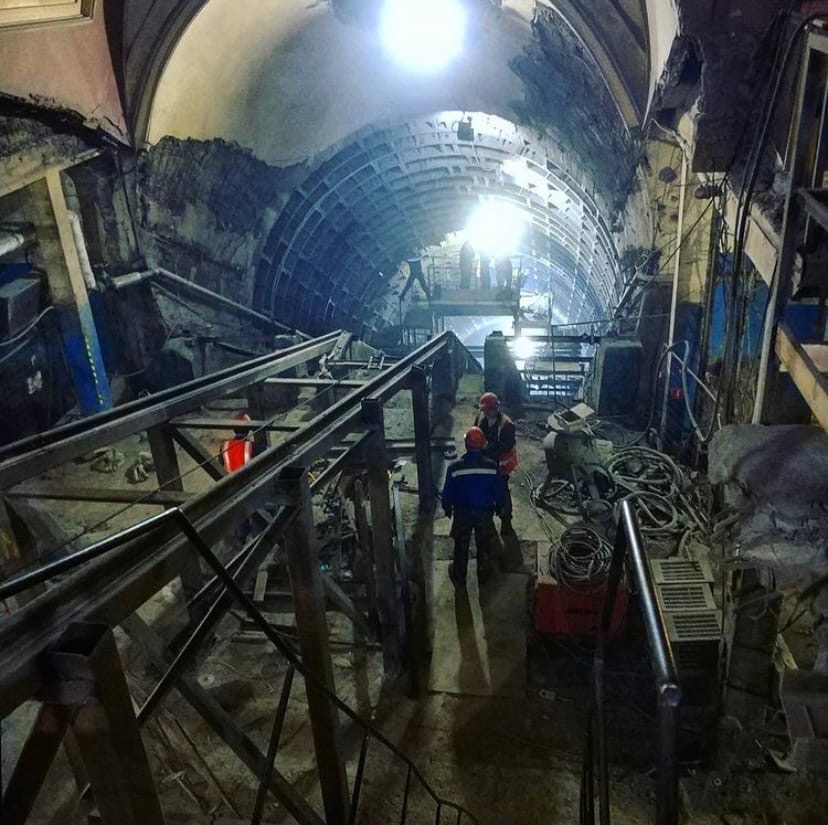 Сейчас строители проводят гидроизоляционные работы чугунных тюбингов наклонного хода, идет устройство железобетонных конструкций наклонного хода и натяжной камеры, перекладка кабельных линий на период строительства. Кроме того, проводится реставрация предметов декоративно-прикладного искусства, в частности: восстановление утрат, изготовление недостающих элементов, восстановление деревянных заполнений дверных коробок, очистка и полировка облицовки стен из мрамора.