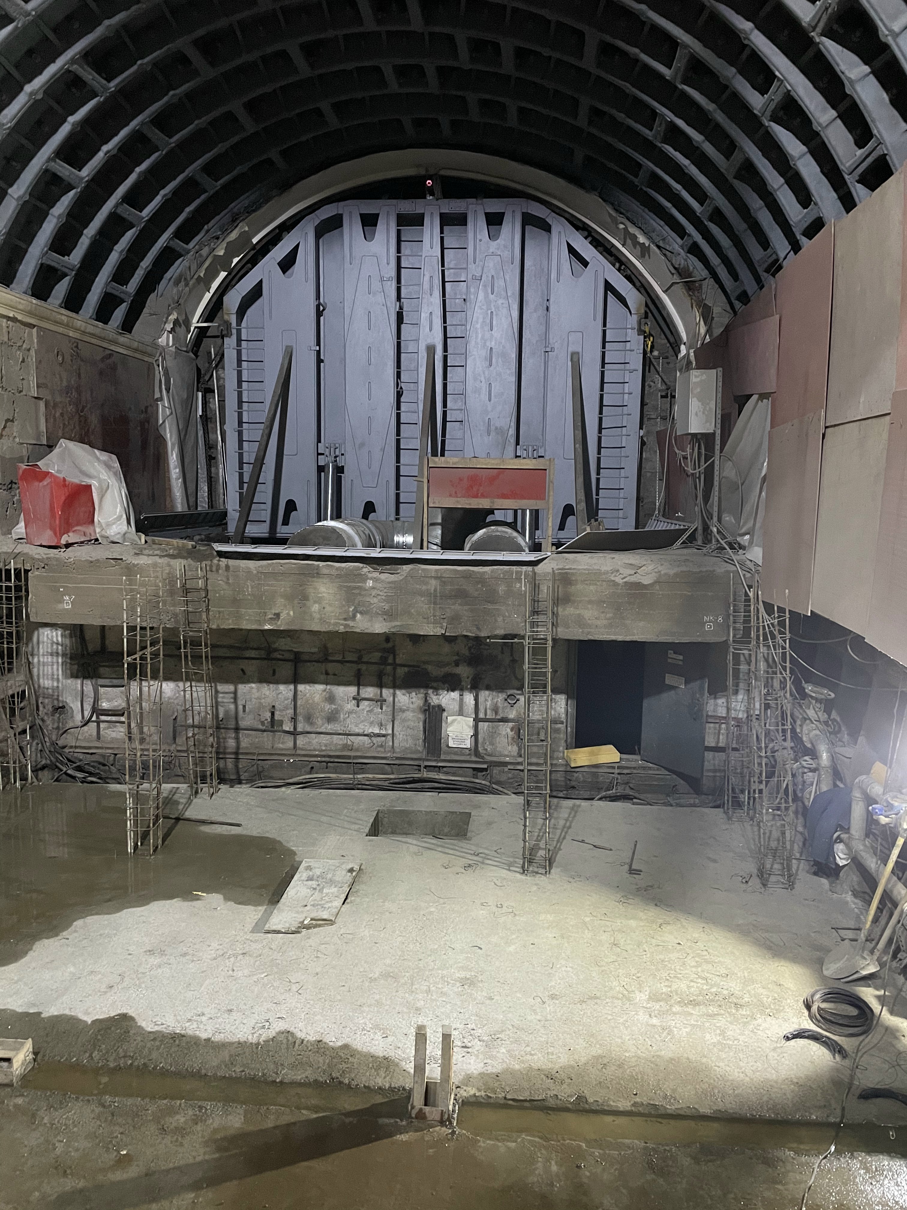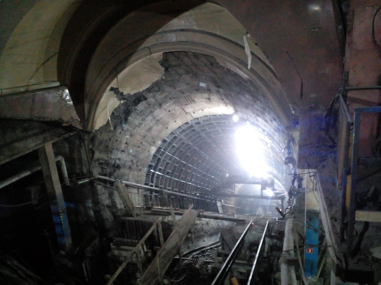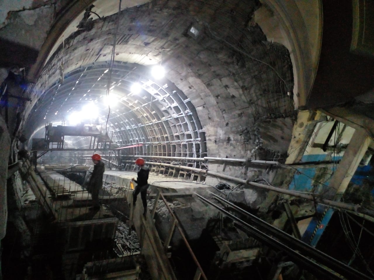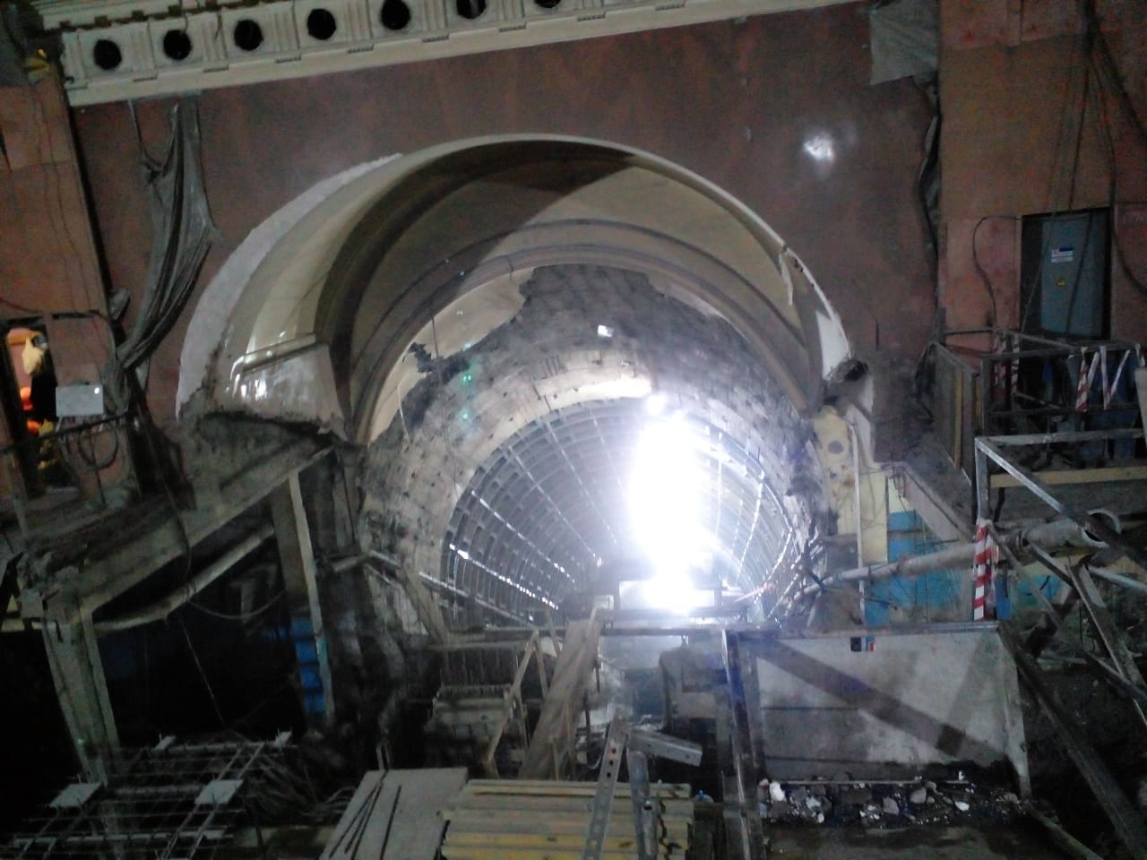На объекте завершено обустройство временных инженерных сетей, проведен демонтаж эскалаторов и водоотливных зонтов, а также внутренних перегородок машинного зала, произведено укрытие элементов декоративно-прикладного искусства, устройство монтажного проема, демонтаж фундаментов под приводные машины эскалаторов, демонтаж перекрытия вестибюля и бетонных конструкций машинного зала, осуществлена замена болтовых скреплений тюбингов, проведены гидроизоляционные работы чугунных тюбингов натяжной камеры с демонтажем бетонного основания натяжной камеры.