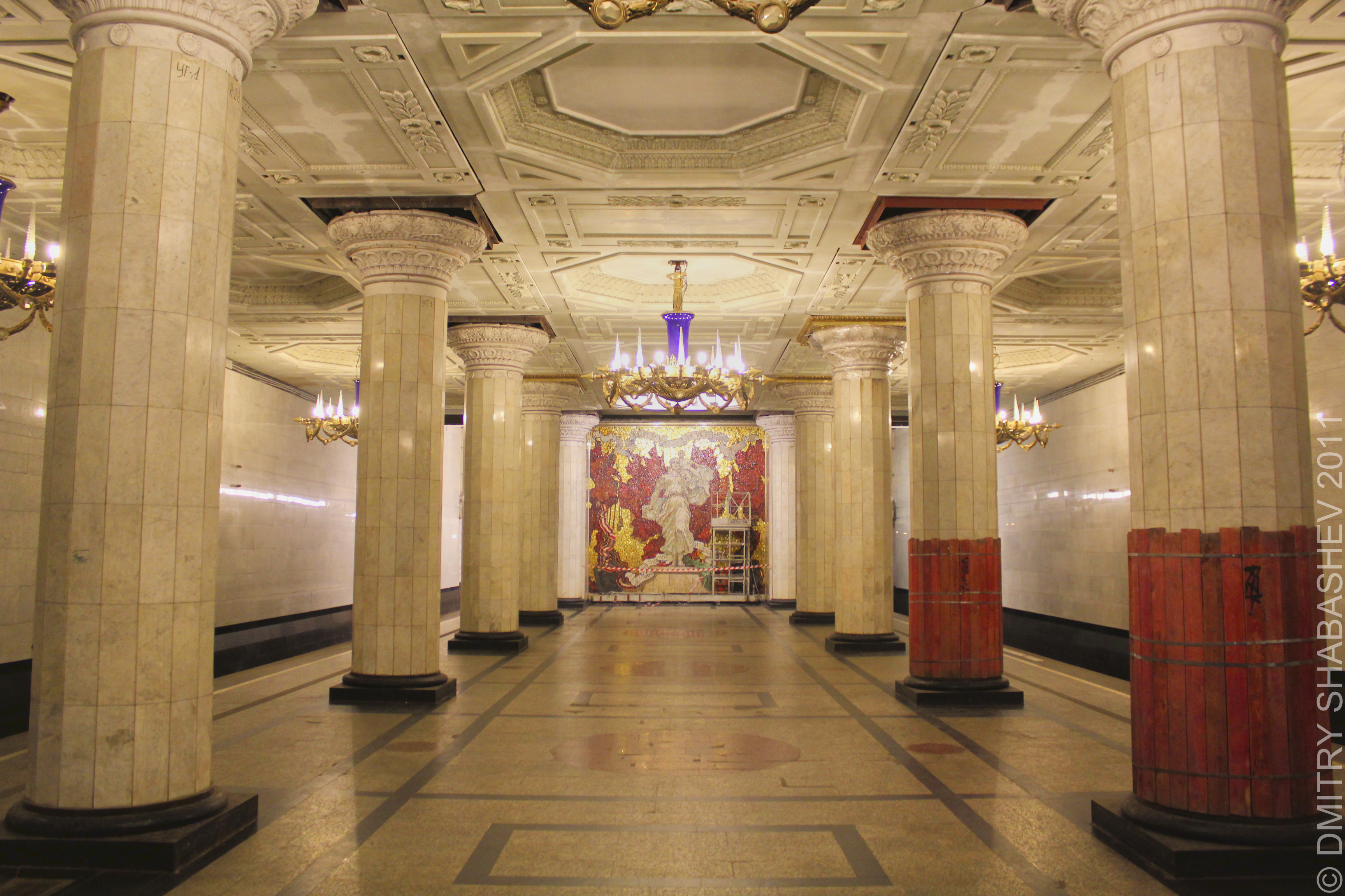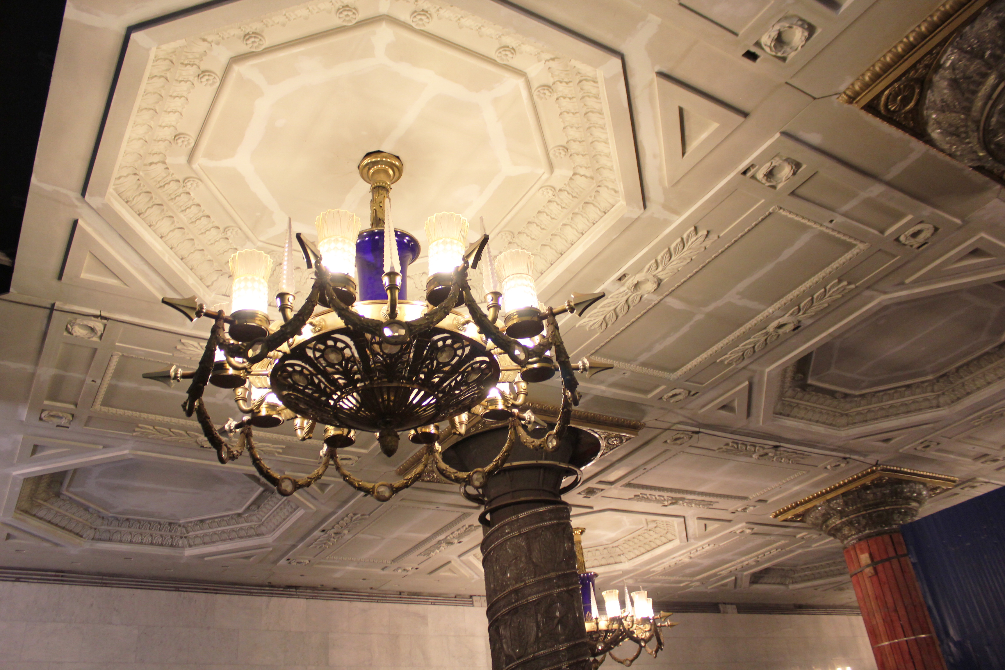 А вот софиты для подсветки панно - не айс. Выходишь из первого вагона - и получаешь ярким светом по глазам. Но мечтать о возврате люстры уже не приходится, судя по всему...