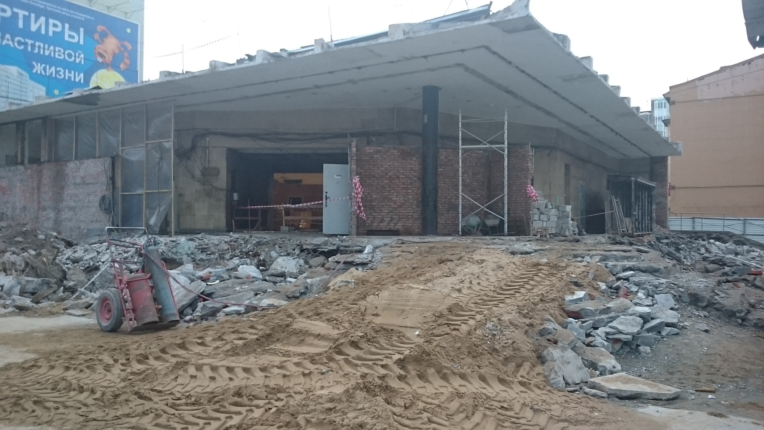 А пока второй день разрушают гидромолотом на экскаваторе-погрузчике JCB стилобат.