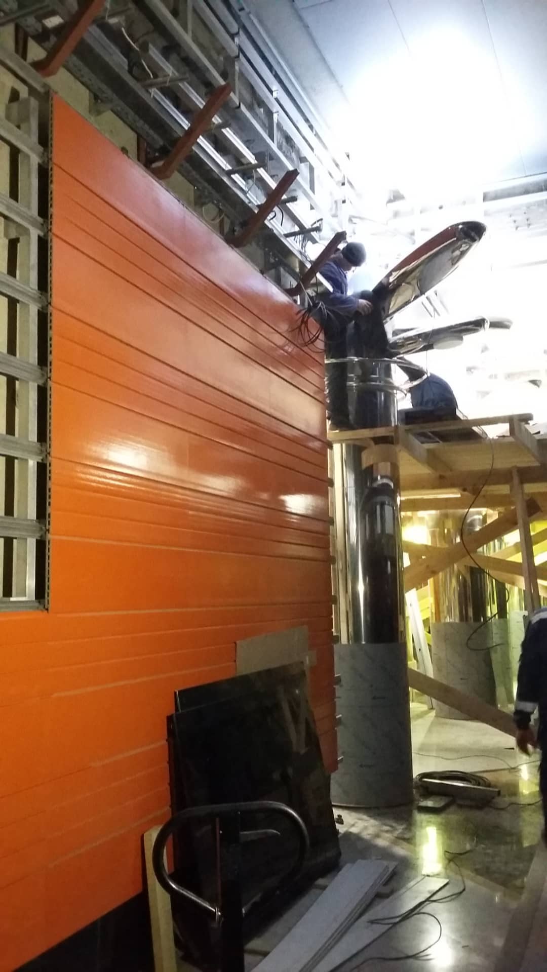 Мне почему-то казалось что карниз около потолка будет плавно переходить в сам потолок. Но похоже я ошибся, то что мы видим - уже финальная отделка потолка (посмотрел внимательнее рендеры от ЛМГТ). Осталось только закрыть дырки у колонн и поставить полоски панелей над карнизом.