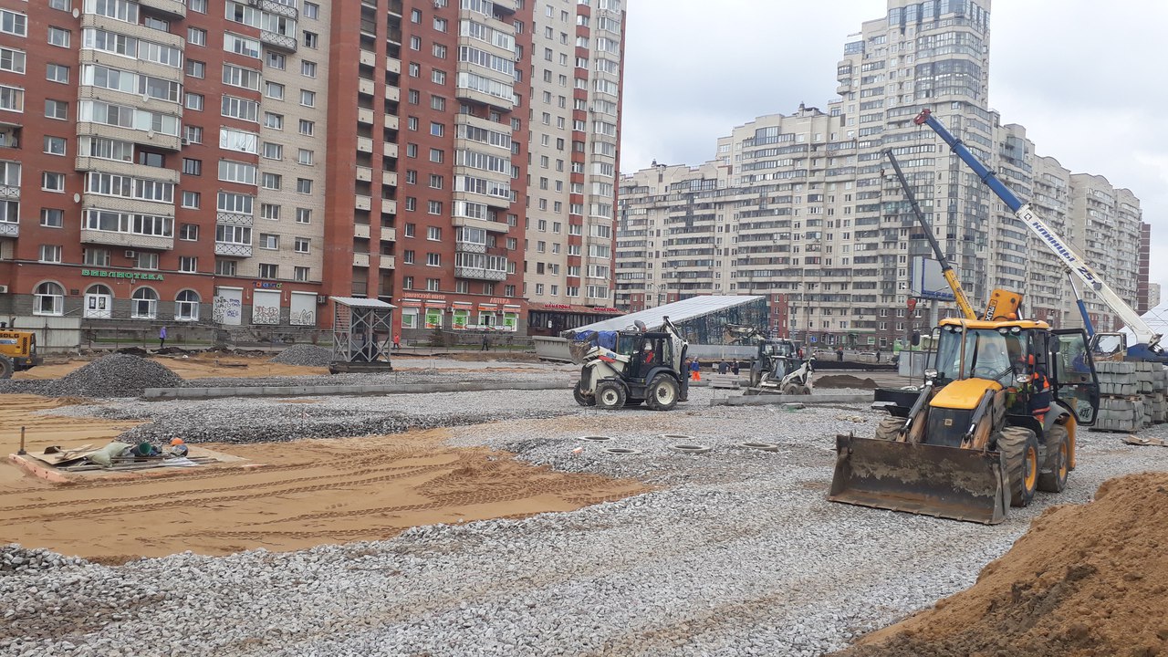 Завезли землю на газоны/клумбы у входных павильонов.
