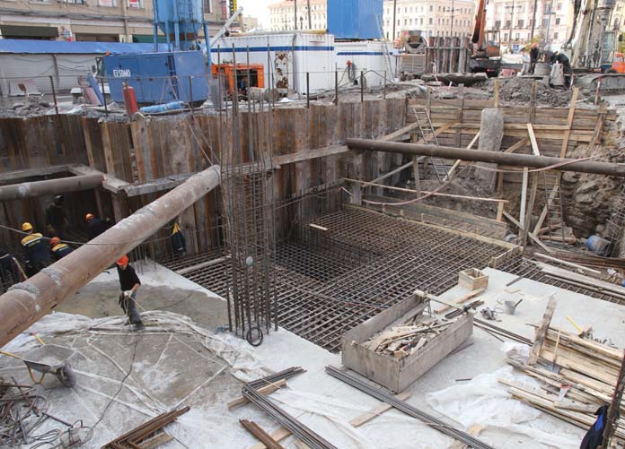 Строители ЗАО «СМУ №13 Метрострой» приступили также к работе на перспективу: заливаем фундамент под установку башенного крана с расчетом на строительство здания вестибюля вверх от нулевой отметки.