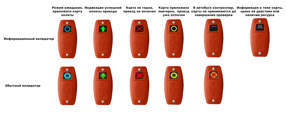 В состав СЭКОП входят валидаторы двух типов простые и информационные. Простые валидаторы имеют светодиодную индикацию, которая информирует пассажира о следующих событиях:
