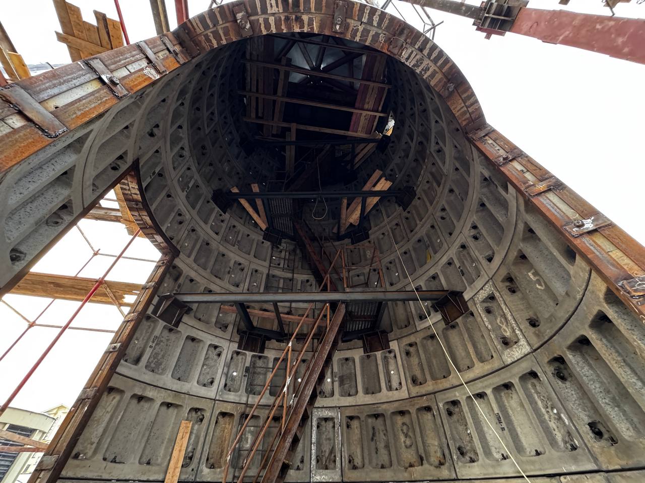 Сейчас здесь продолжается работа по устройству копра шахты. В дальнейшем весь комплекс, который здесь сооружается будем важной частью перехода между станциями «Кировский Завод» и «Путиловская».