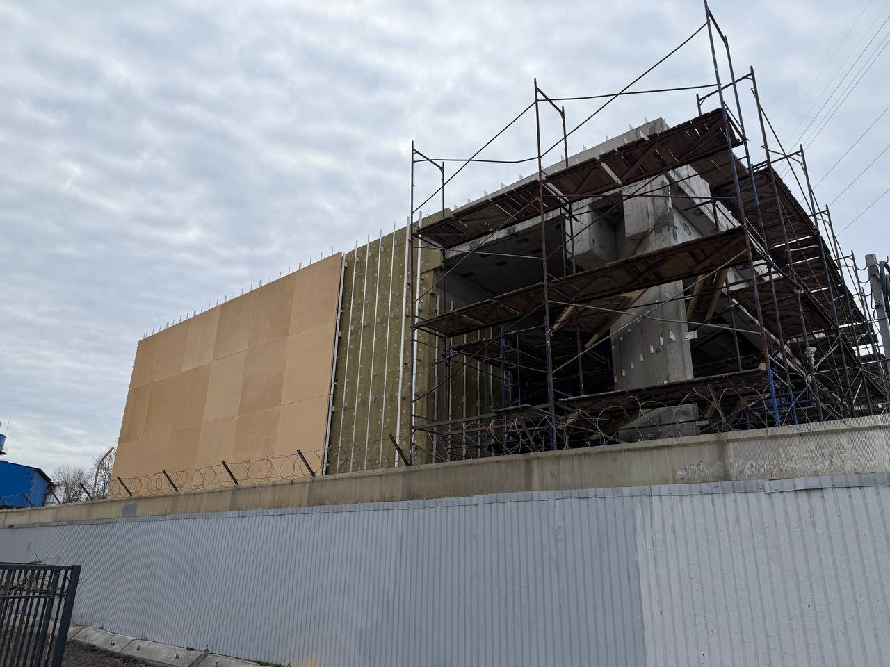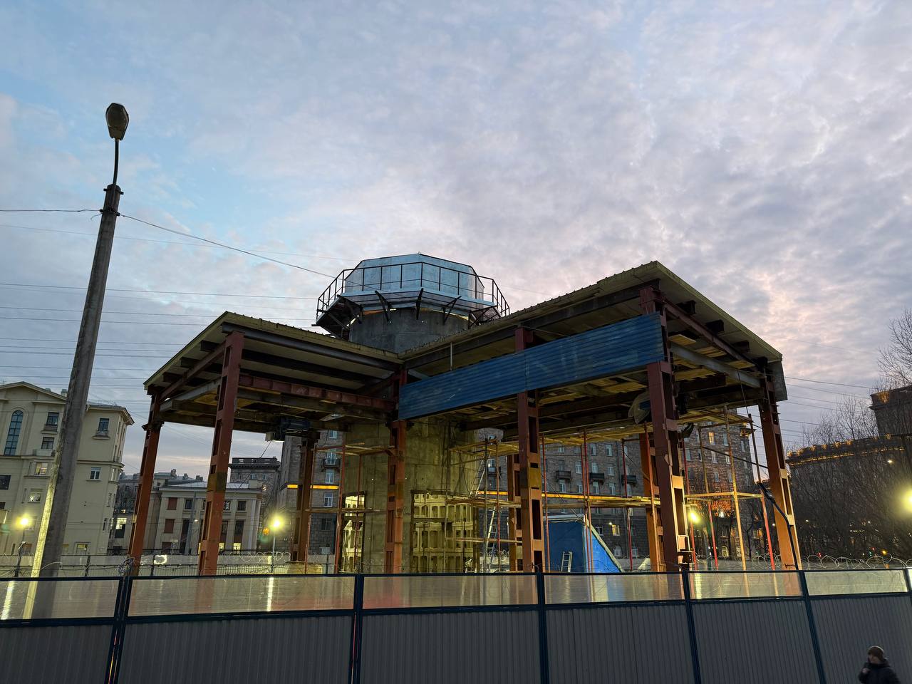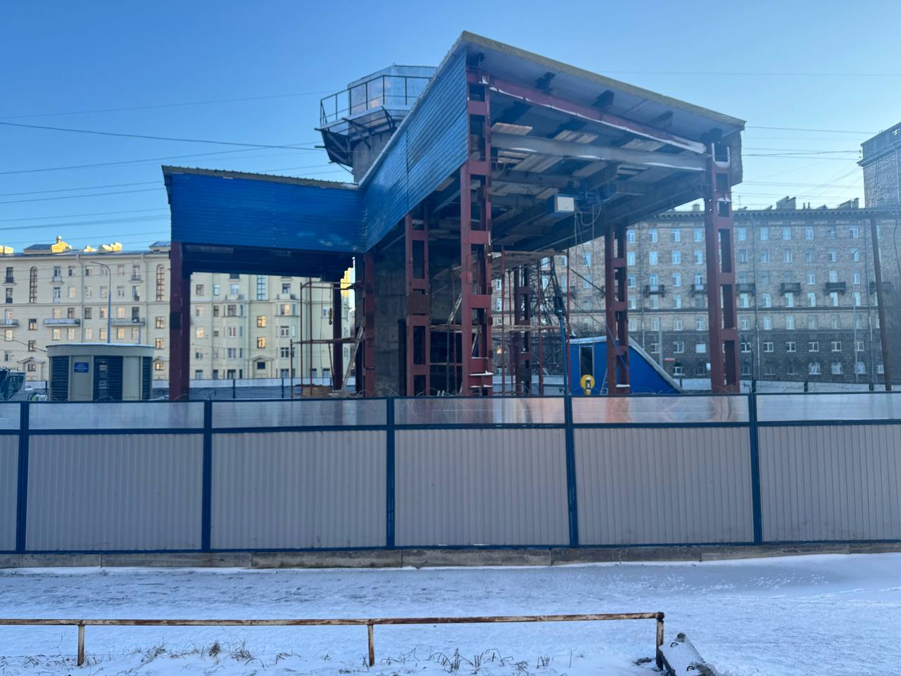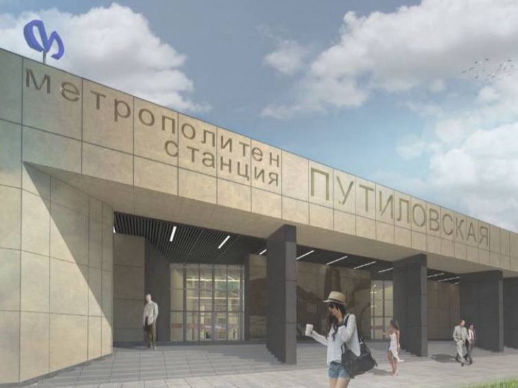 На строительстве вестибюля станции «Путиловская» Красносельско-Калининской линии Петербургского метрополитена продолжаются отделочные работы фасада вестибюля.