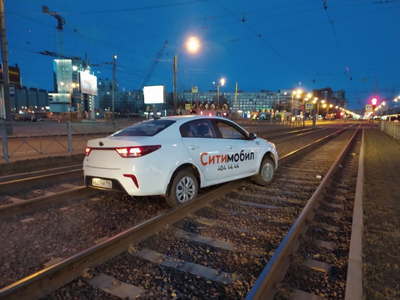 2. 9 апреля 2021 г. Ранним утром, водила такси ехал по трамвайной выделенке, и на встречке ещё не было открыто движение. Застрял в рельсах.