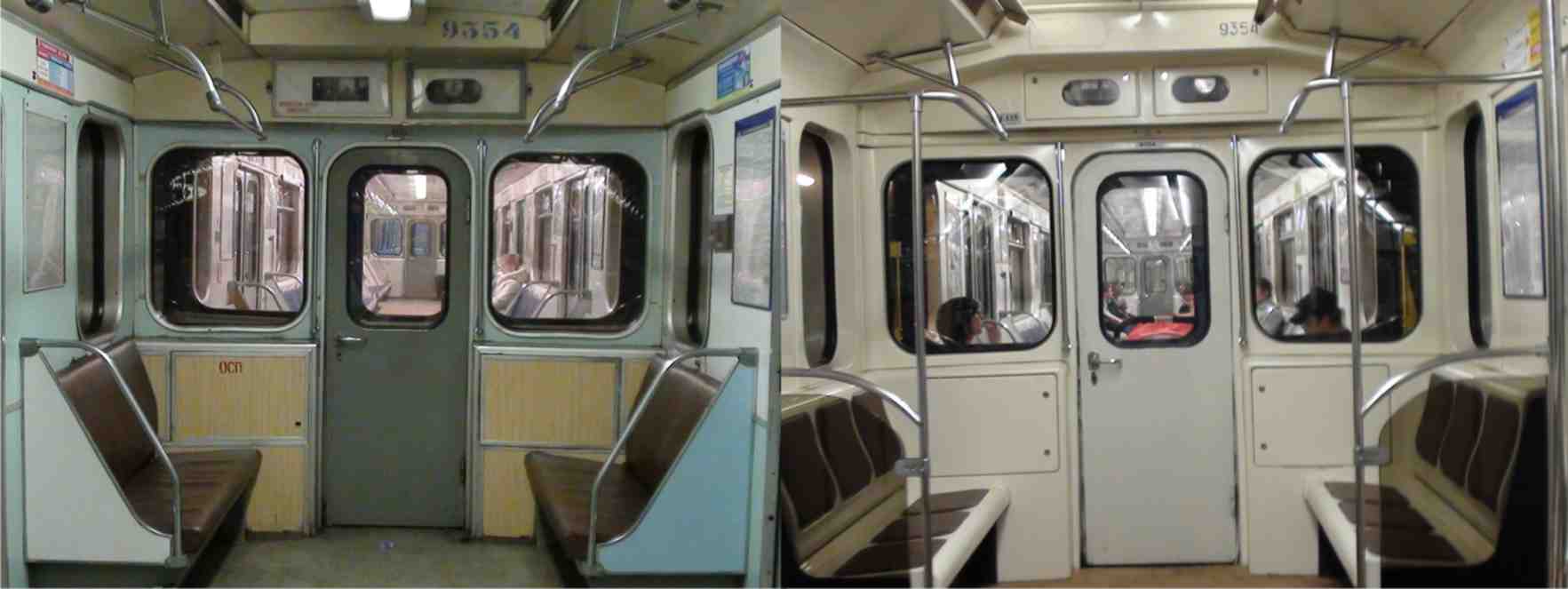 9354 теперь тоже переодет в ЛСК-4. До КР был интересный салон. Внутри были всевозможные цвета пластика, кроме тёмного дуба. Как известно, так произошло из-за того, что вагон долгое время стоял на улице, составляя компанию 9351, затем 9351 порезали, а 9354 был только на половину разобран, включая пластик. Затем 9354 всё-таки дособрали из подручных материалов, и вернули на линию. В таком виде он ездил лет 20. И вот теперь, после КР он ни чем не отличается от таких же ЛСКшных.