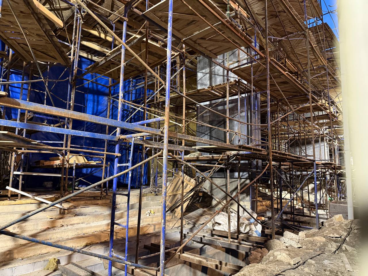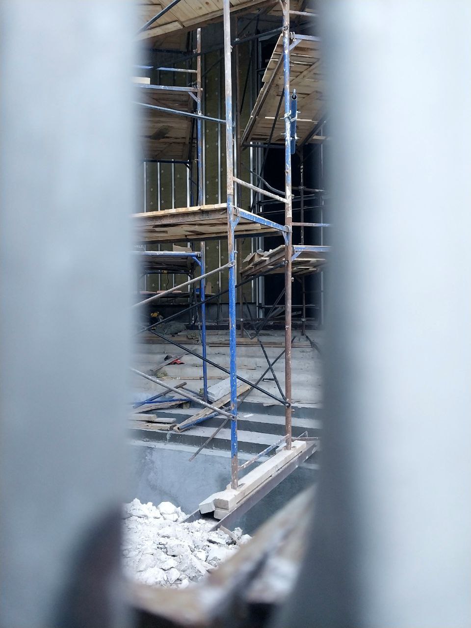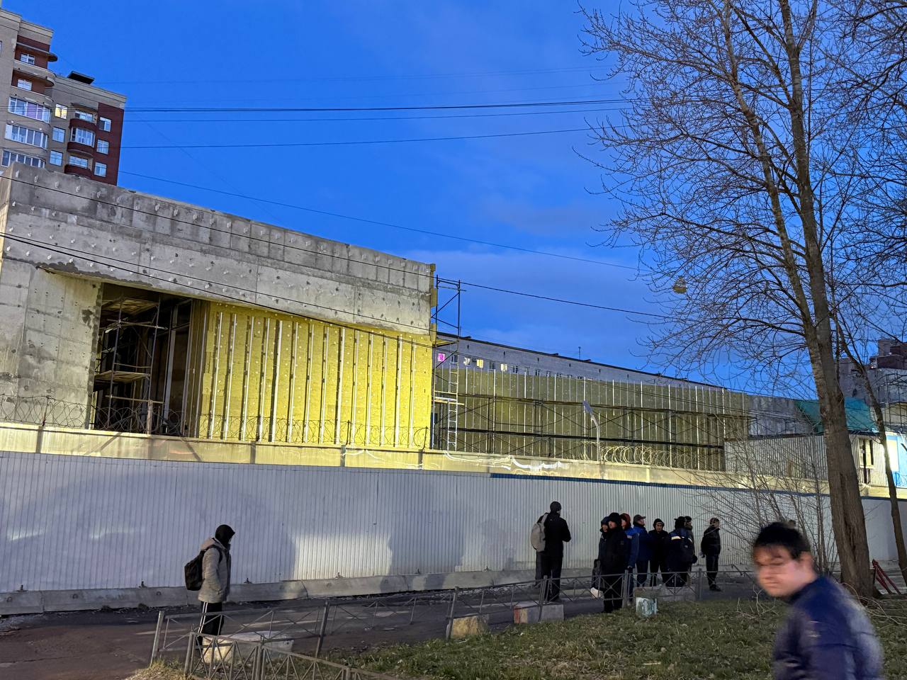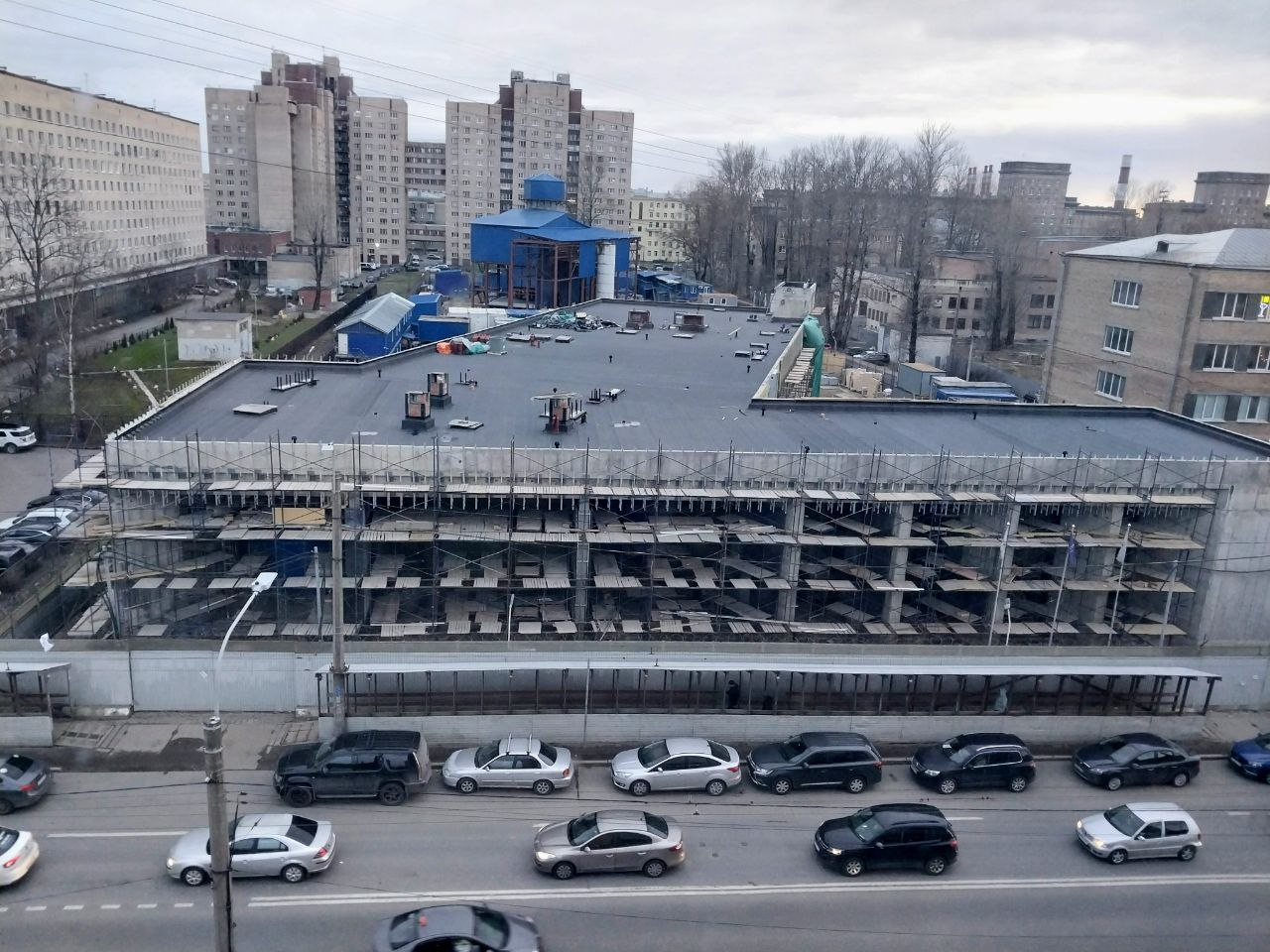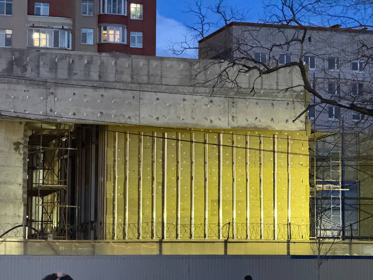Продолжаются работы над фасадом здания. Строители выставляют направляющие, после чего утепляют комплекс и вешают вентилируемый фасад.