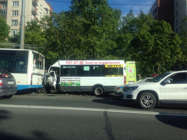 Троллейбус и маршрутка столкнулись на Ветеранов, 8 пострадавших/ В результате столкновения пострадали две пассажирки троллейбуса, водитель маршрутки и пять пассажиров.