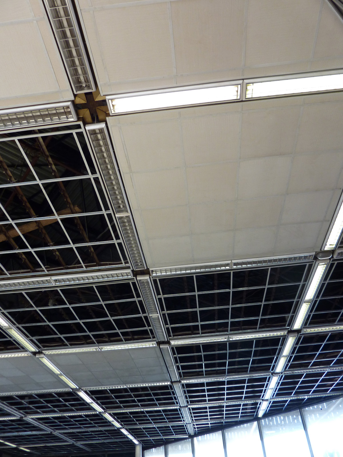 Позавчера сделал фото потолка. Прошу прощения за качество-всё делалось на бегу... Часть решёток под плиты разбирают. Видимо, планируется изменить конструкцию.