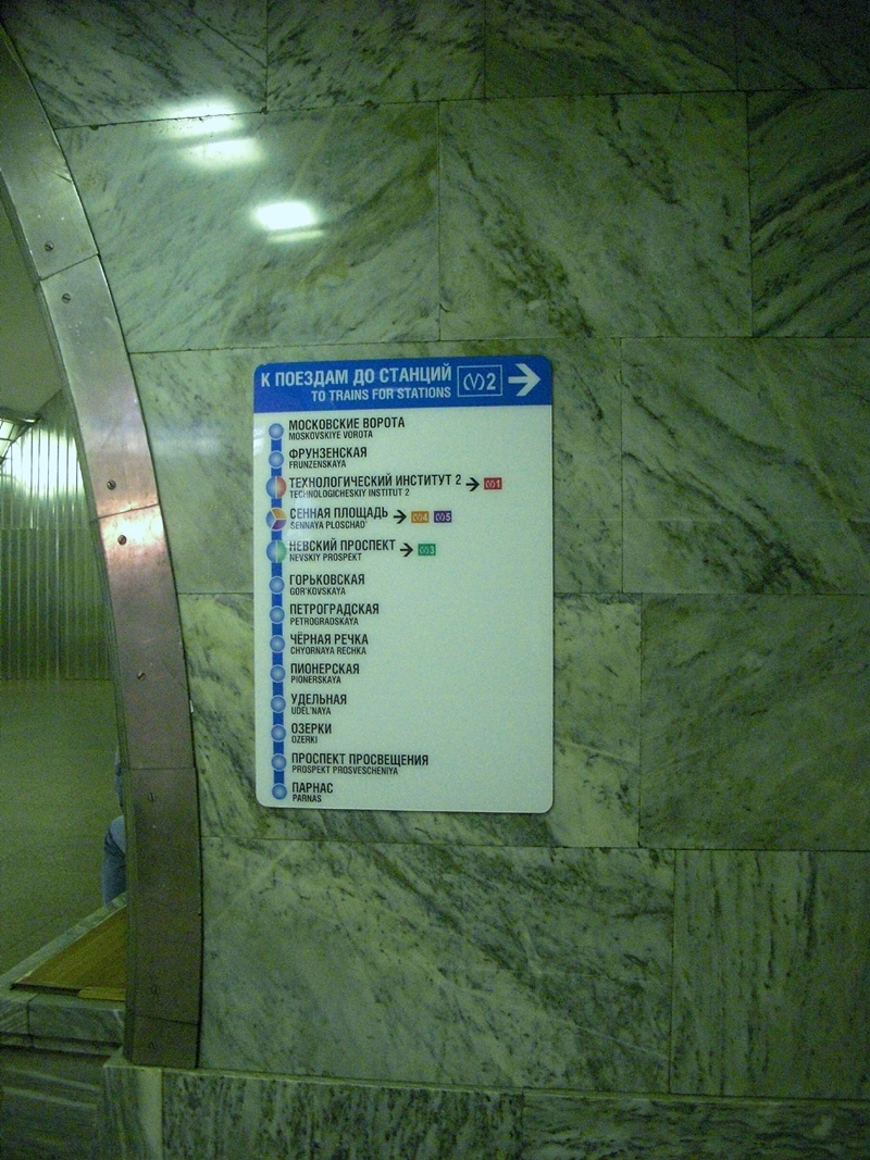 Тем временем на Электросиле появились новые указатели "к поездам до станций" volkovskaya-style. Как http://metro.nwd.ru/viewtopic.php?f=9&t=4622&start=315 только под М2, с кружочками и всё заглавными. Закреплены на 2 и 4 проходах.
