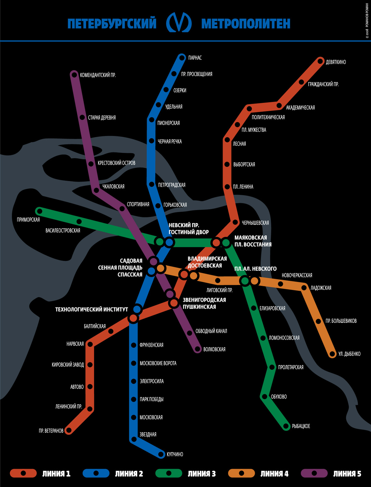 Во-вторых, курсивное начертание шрифта ужасно. Его невозможно прочесть. Лучше простого текста без выпендрёжа западная цивилизация пока не придумала. Да, и убери цвет из названий станций. Чёрного вполне достаточно. Для пересадок можно оставить, либо сделать, как у Бирмана, а подписи типа «ж.-д. станция „Старая деревня“» надо делать чуть меньше, кегля на два, так как это — не слишком значимая, хотя и важная информация.