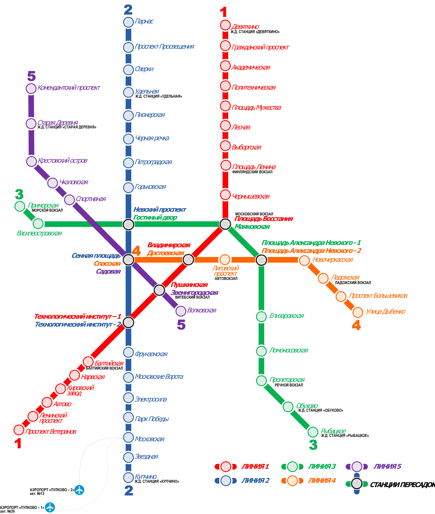 В-четвёртых, я бы ещё подумал бы над кружками. Твой вариант неплох, но есть ощущение того, что «чего-то не хватает», хотя к такой схеме я бы быстро привык, а это — хорошо. Плюс на 1-й линии на юго-западе слишком много косяков, лучше направить её параллельно 2-й, изменив для этого угол. О том, какая предстоит дорога до аэропорта, знать пассажиру необязательно. Достаточно отметить, что от «Московской» едет маршрутка до Пулкова.