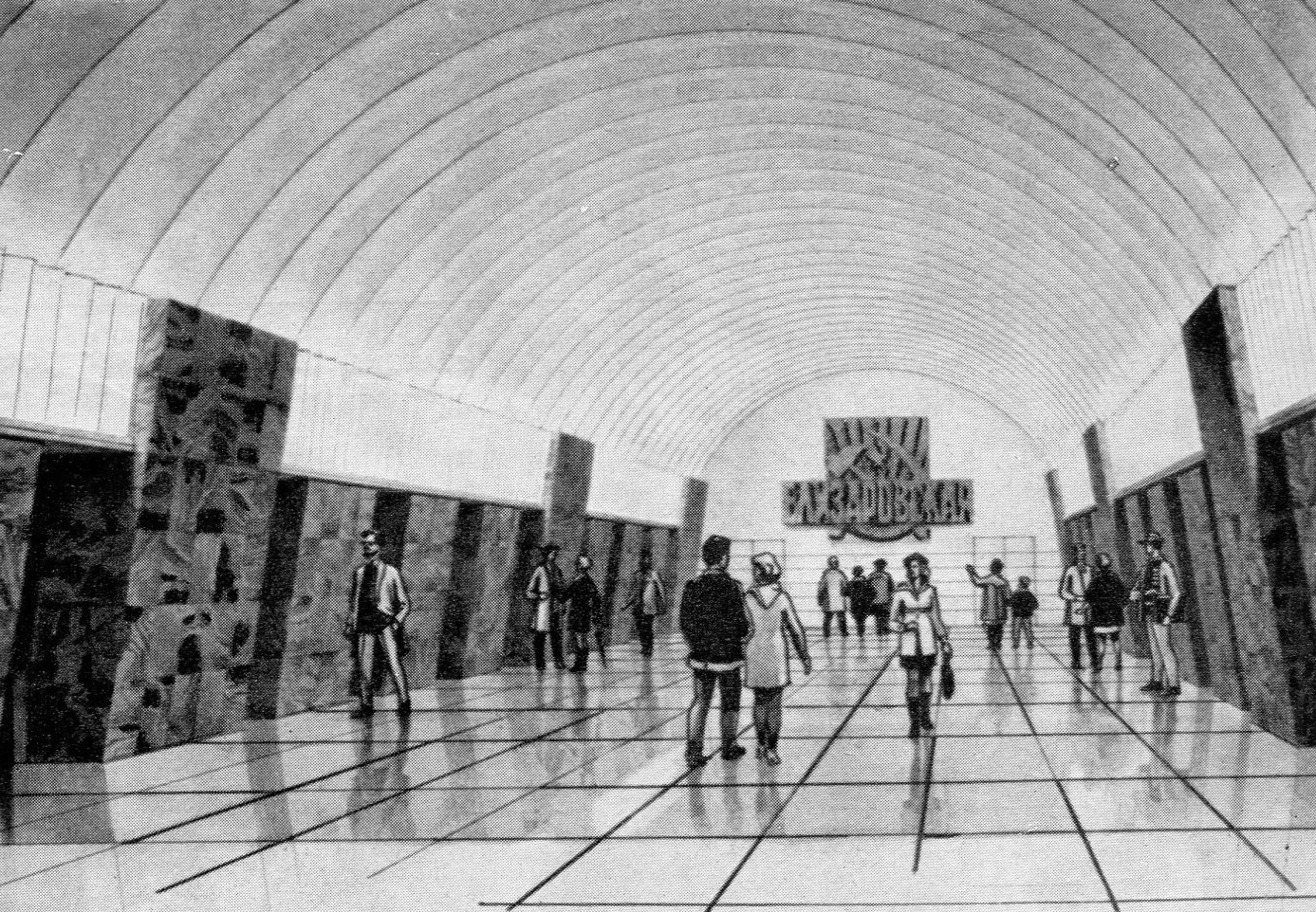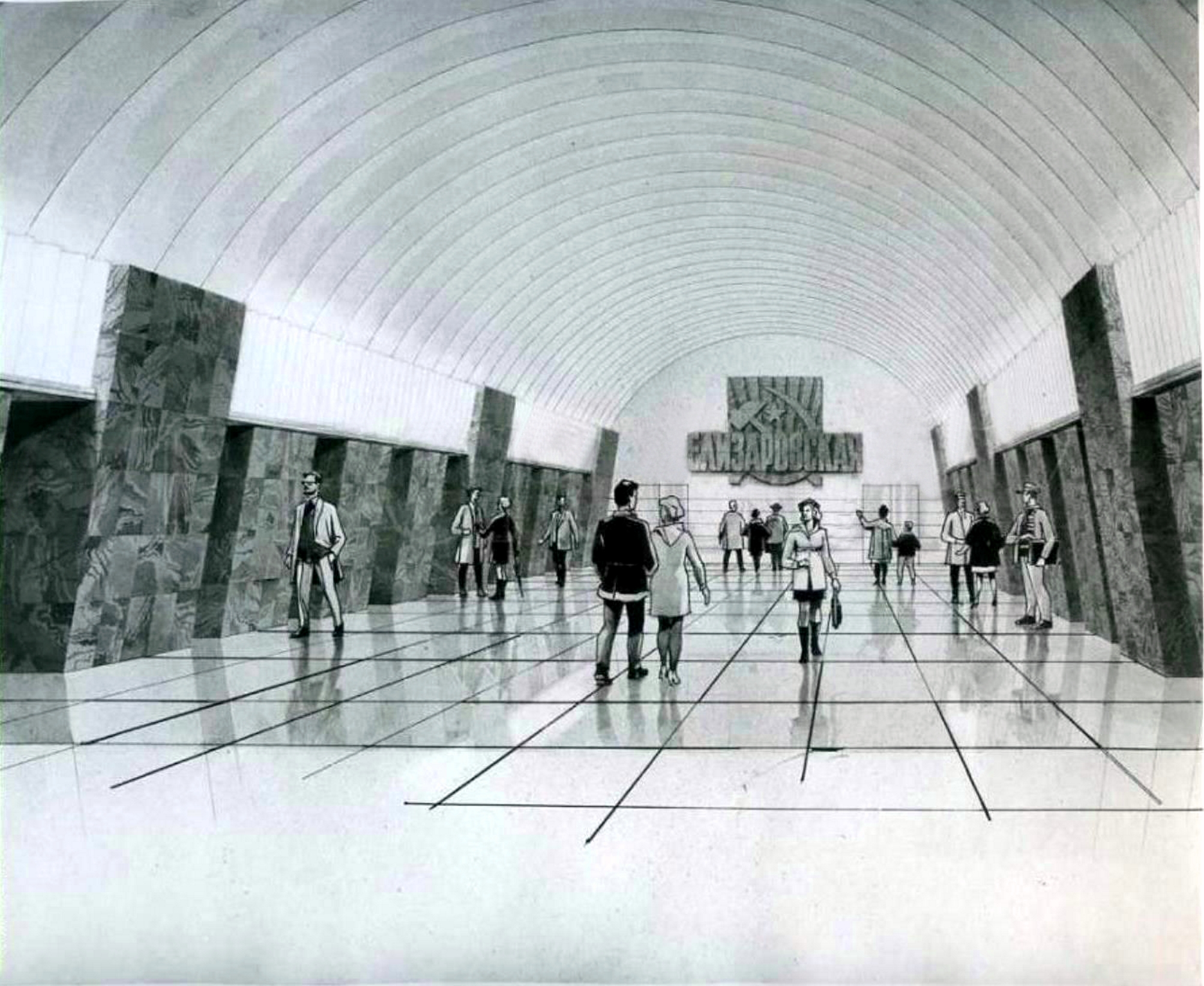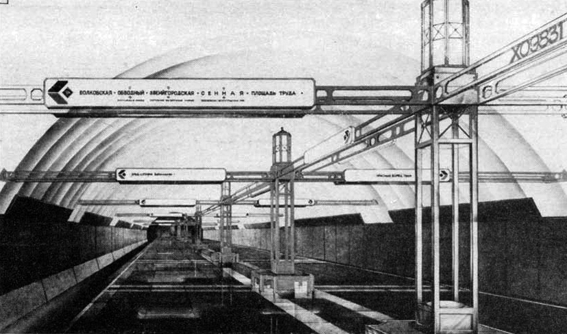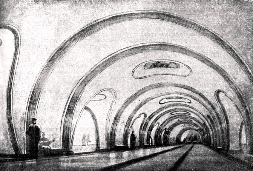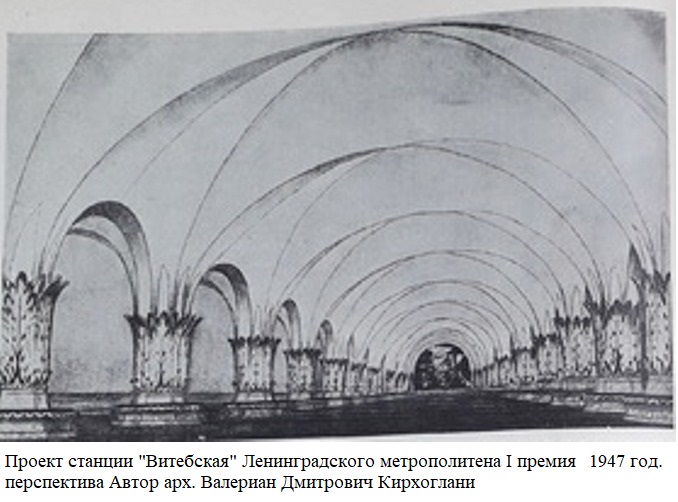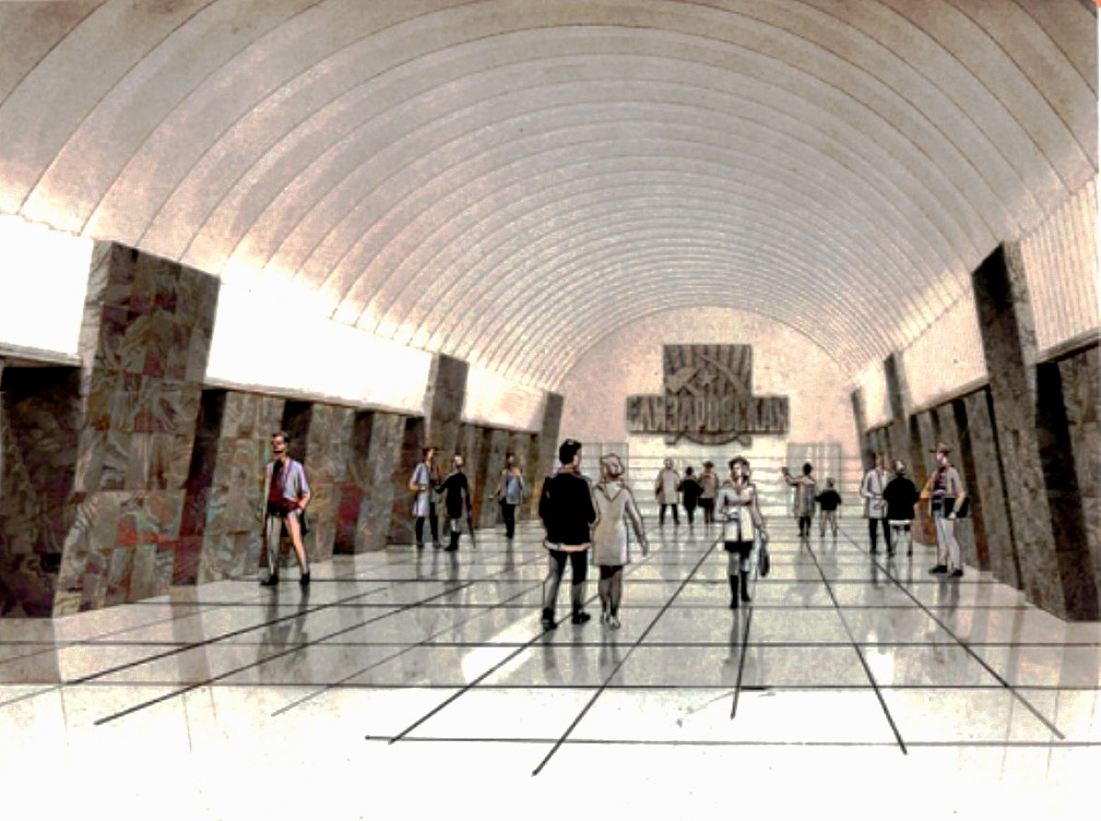 Один из вариантов станции Кировская (Кировский завод) Авторы проекта архитекторы Каменский и Ашрапян, 1947 год. Эскиз любезно предоставлен коллегой по форуму с ником „misha“ с его проекта neleningrad.ru. С разрешения автора R