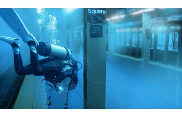 Станция подсвечена как днём. Даже если Таймс Сквер (или какая там станция) и полностью затопило, станционное освещение вряд ли работало бы так ярко - скорее всего его вообще не было бы. А подсветкой для кадра столько света не сделать. Да и зачем собственно снимок и вообще, водолаз...Однозначно монтаж. К тому же сомнительны пропорции водолаза и столба.