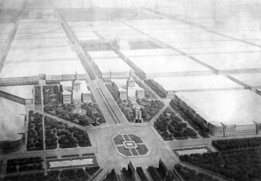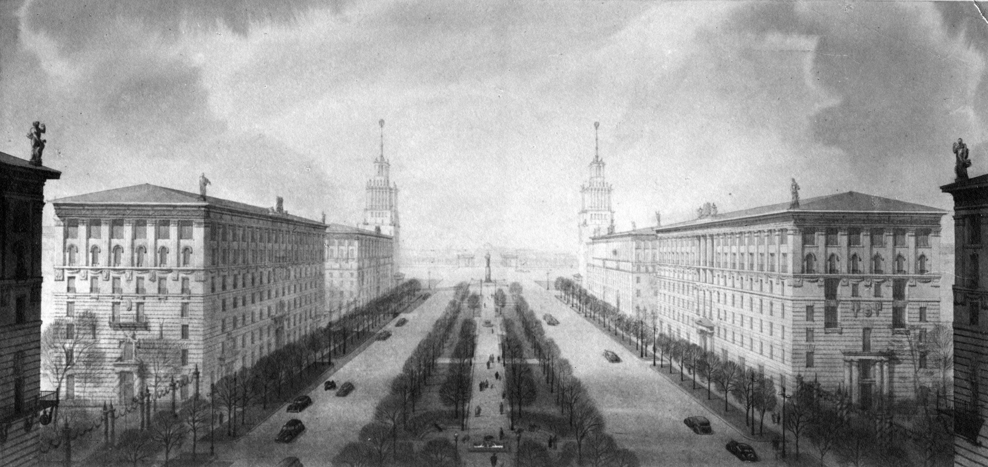 Московский Парк Победы. Здание со шпилем, похожее на МГУ, должно было находиться там, где сейчас СКК