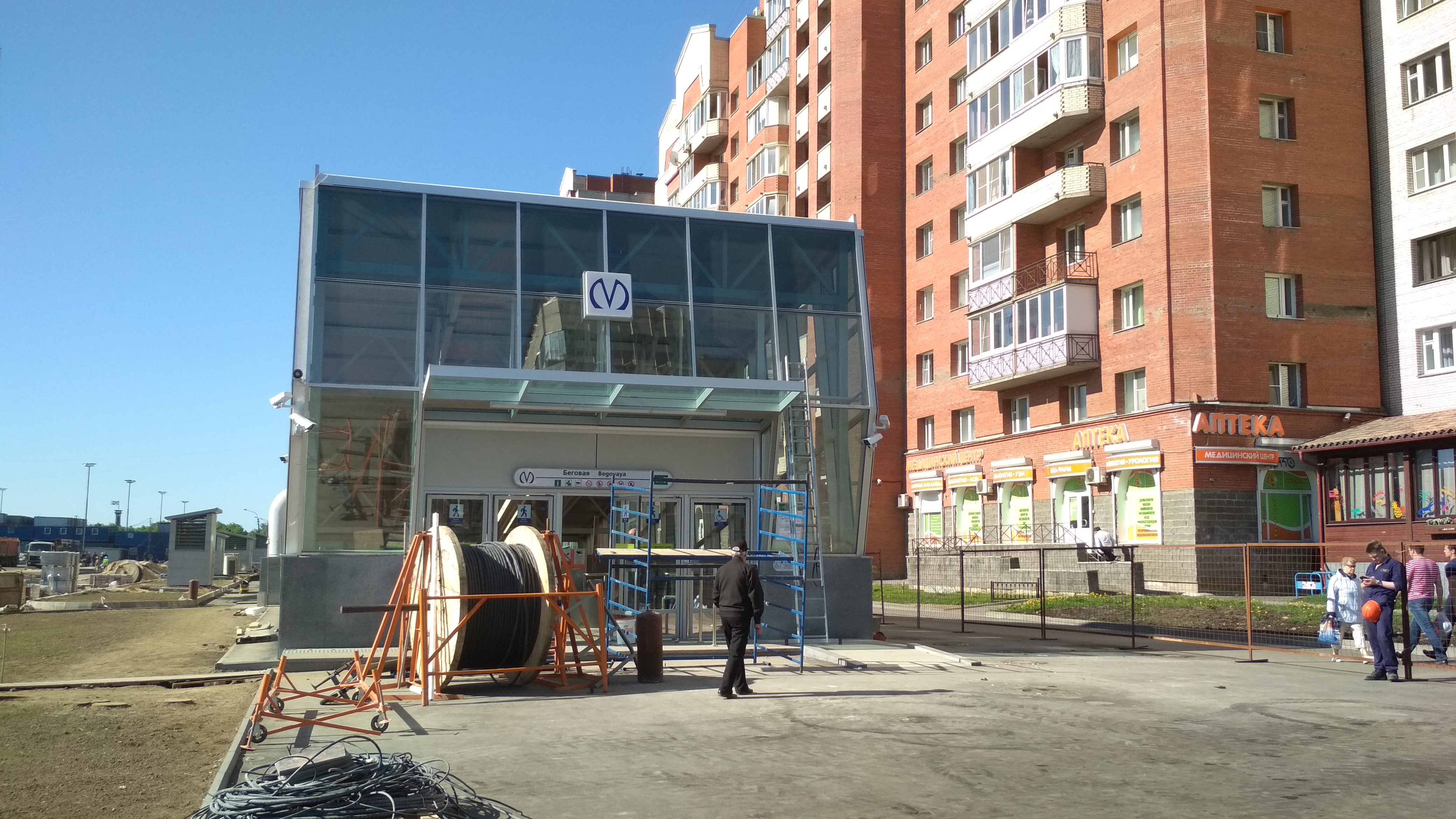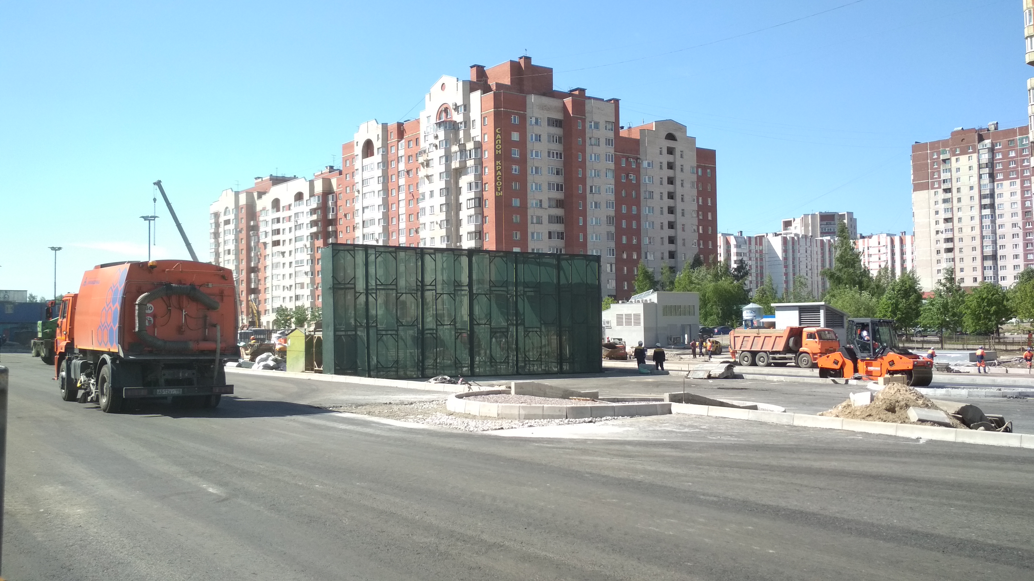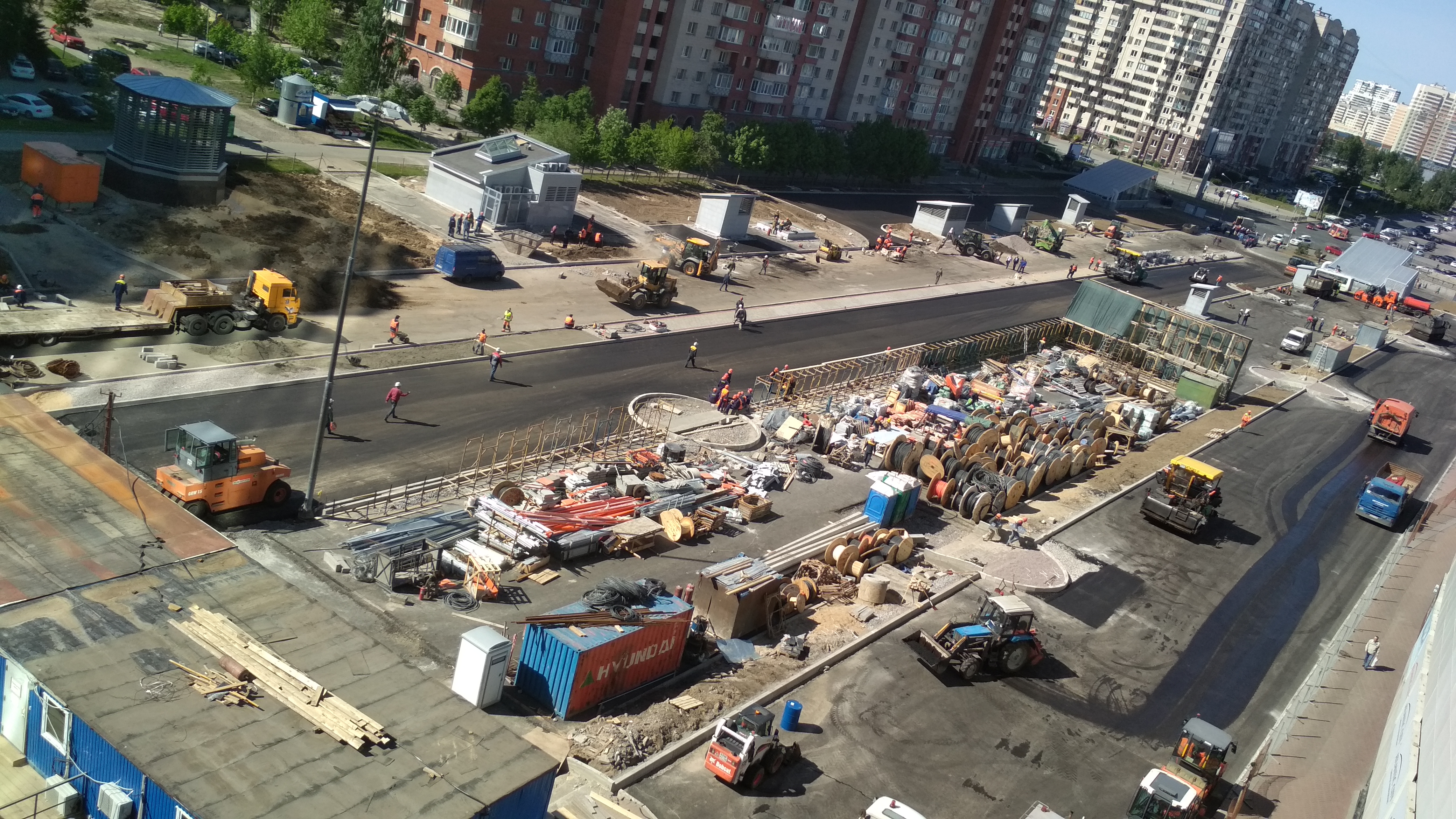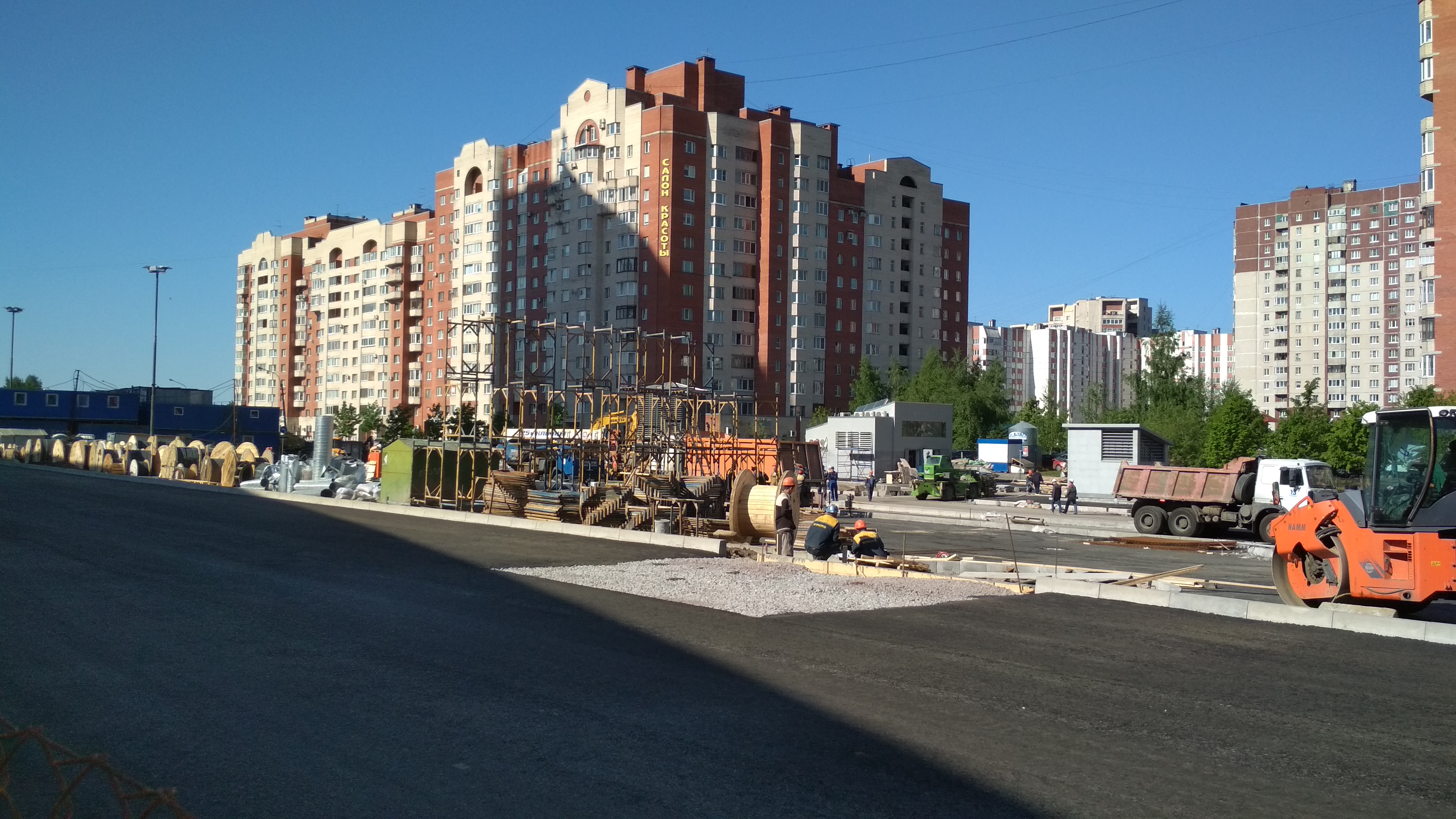 ) , местами развешены камеры и информационные таблички. Катушки с кабелями кочуют из угла в угол по площадке, асфальтовые поля растут.В центре стройплощадки собирается конструкция, очевидно для баннера "Указ партии-выполним!" "Метрострой-городу"
