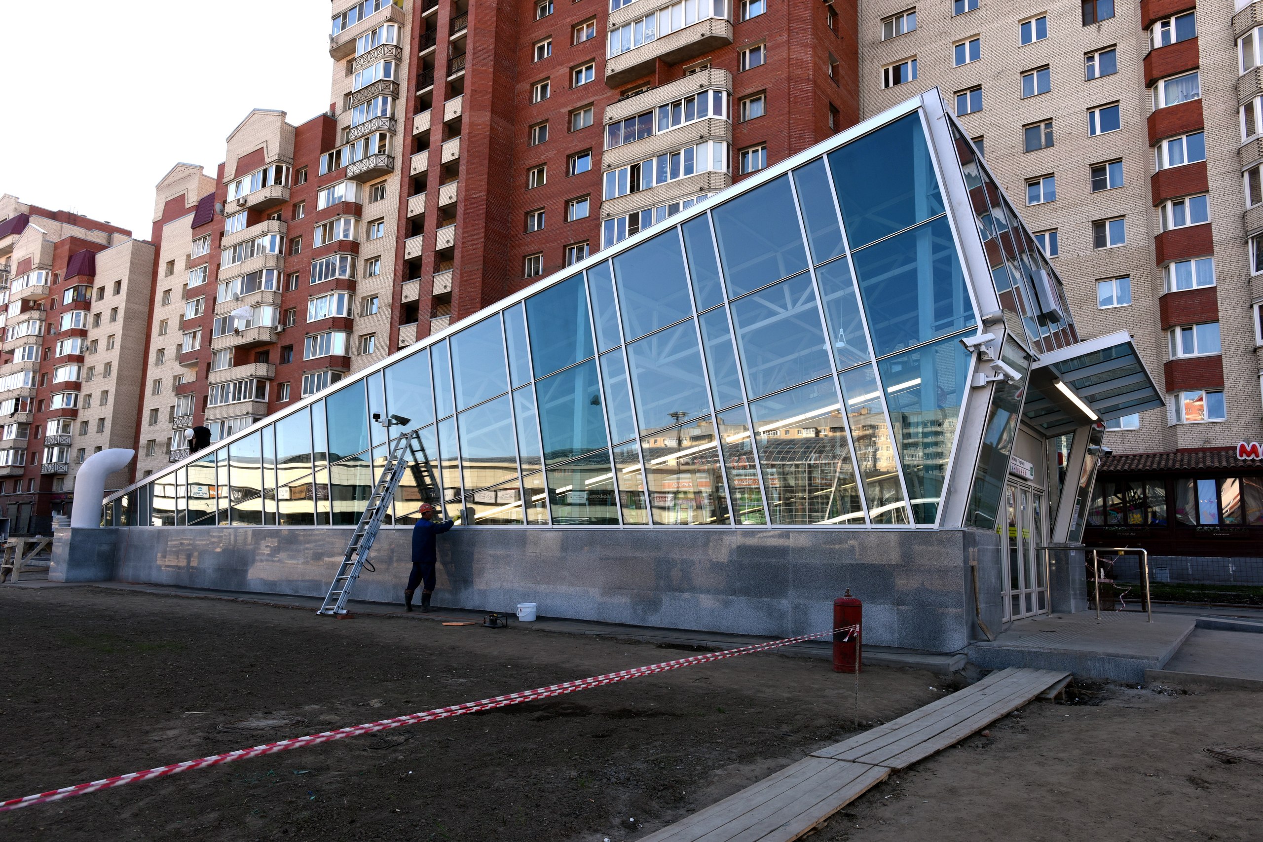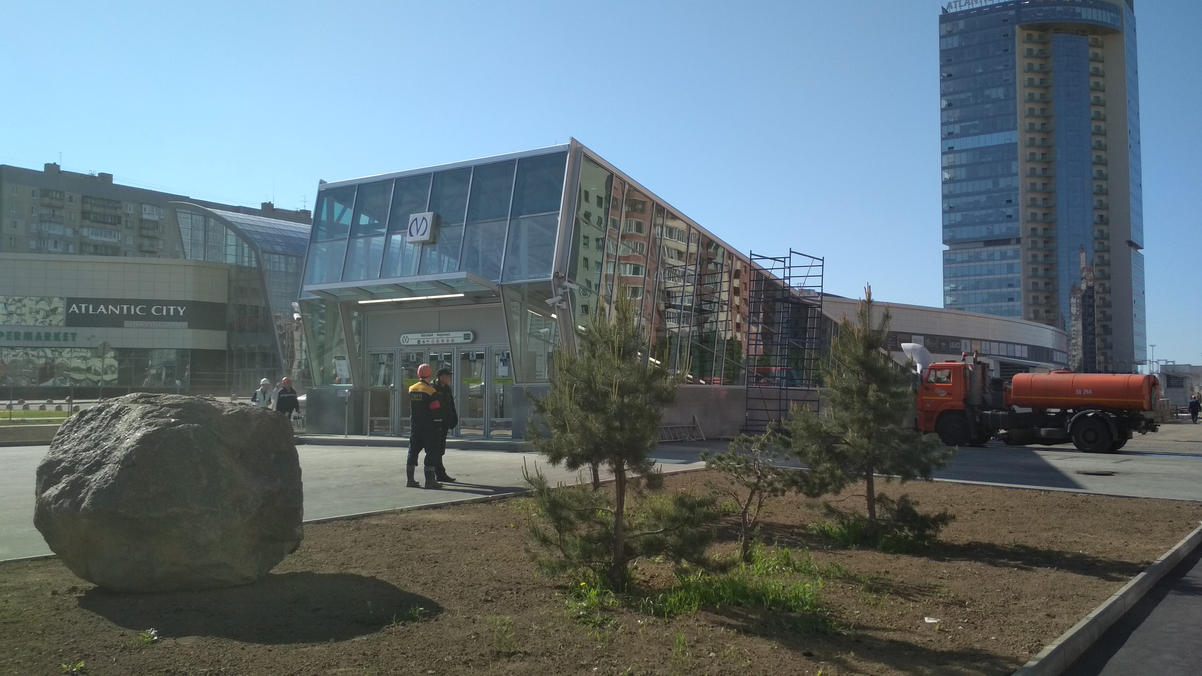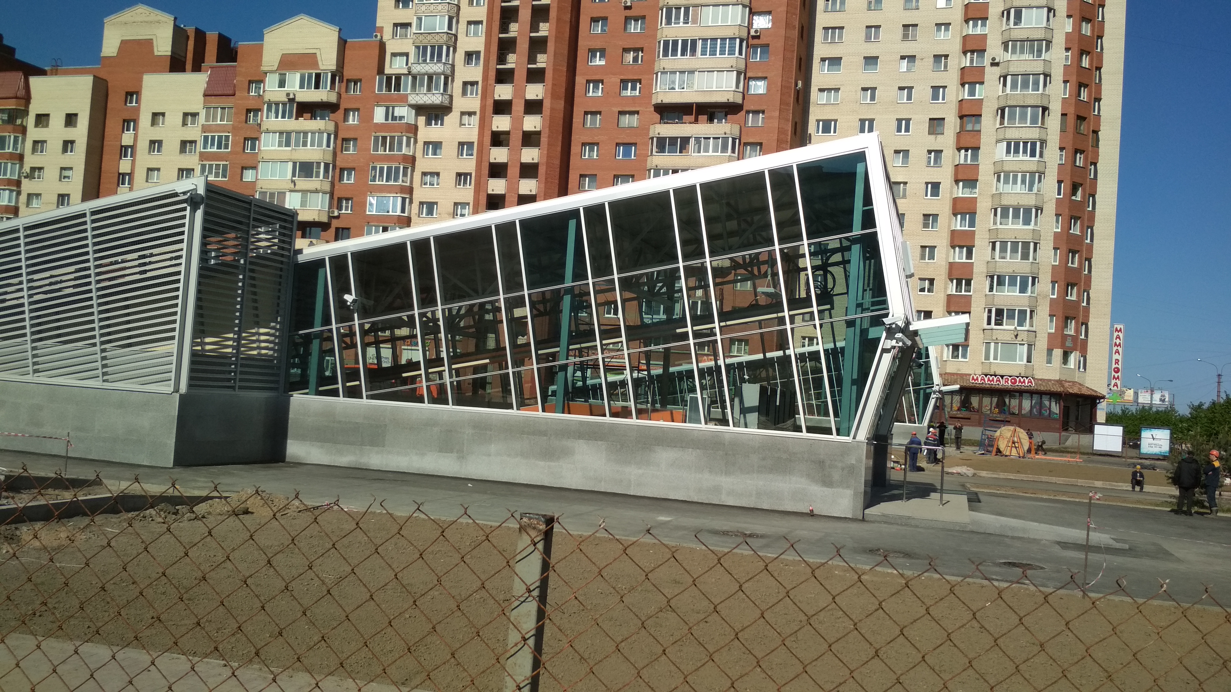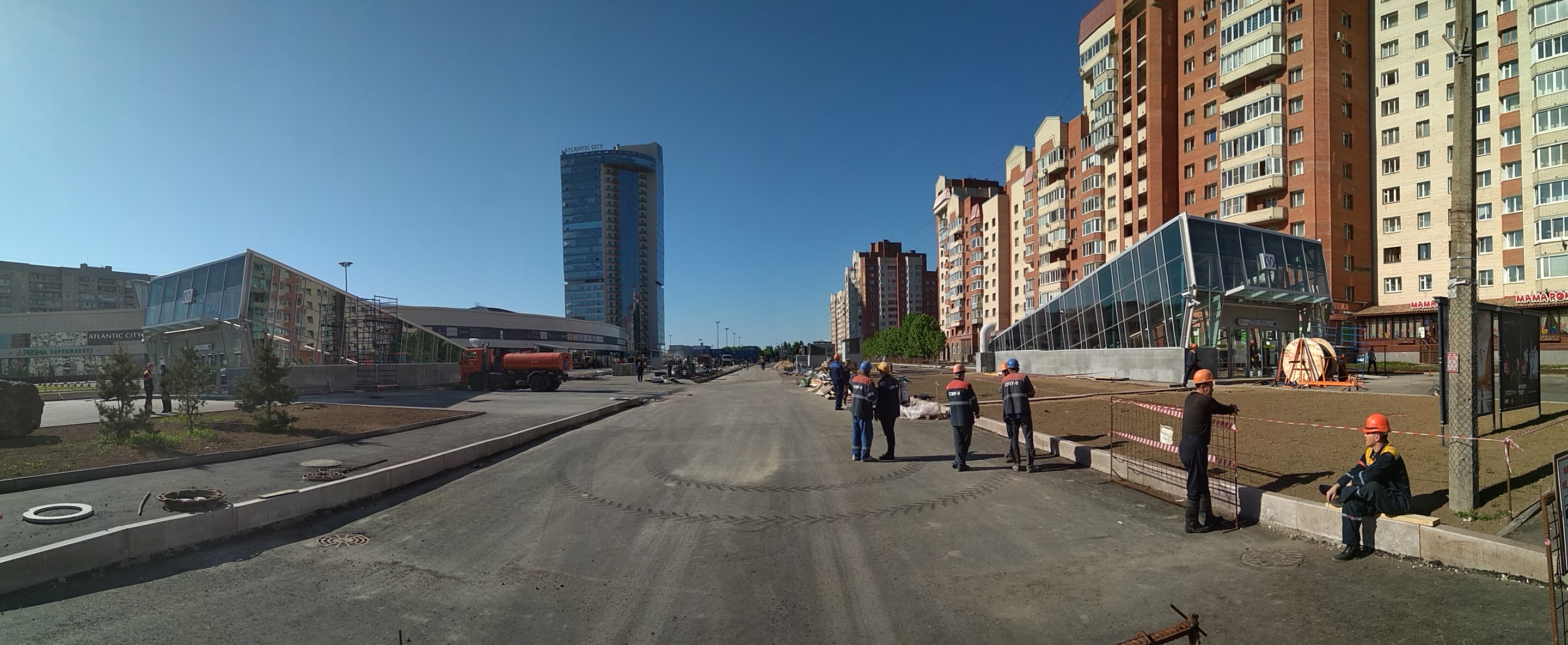 ) , местами развешены камеры и информационные таблички. Катушки с кабелями кочуют из угла в угол по площадке, асфальтовые поля растут.В центре стройплощадки собирается конструкция, очевидно для баннера "Указ партии-выполним!" "Метрострой-городу"