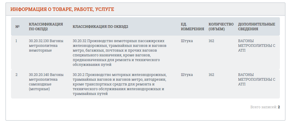 В рамках данного аукциона осуществляется поставка новых вагонов метрополитена в количестве: