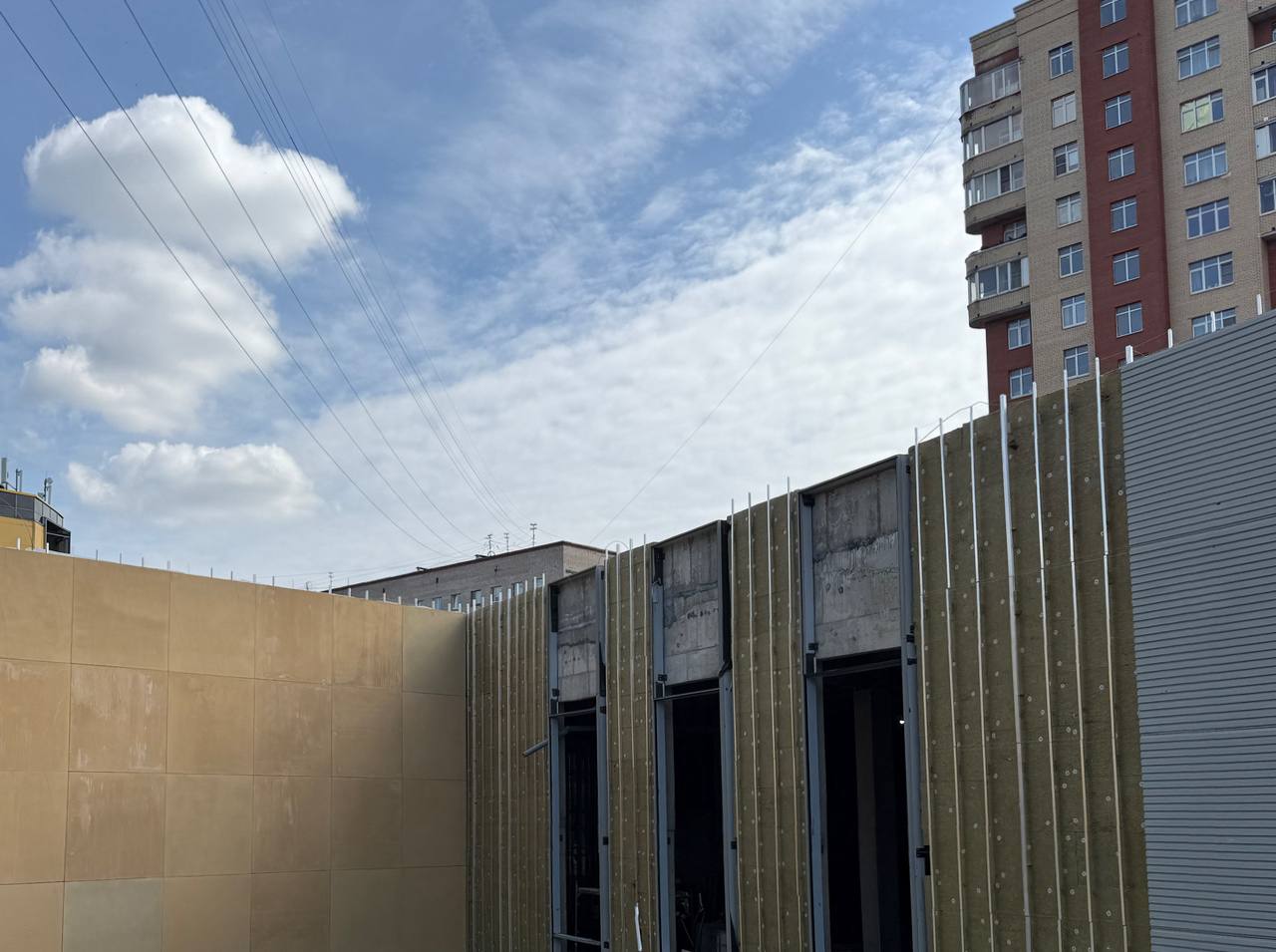 Со стороны ДК имени И.И. Газа приступили к установке плит из стеклофибробетона серого цвета.