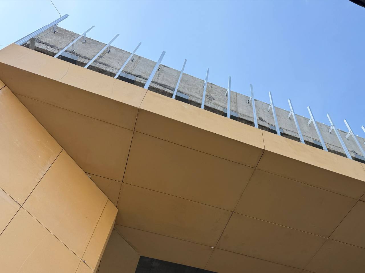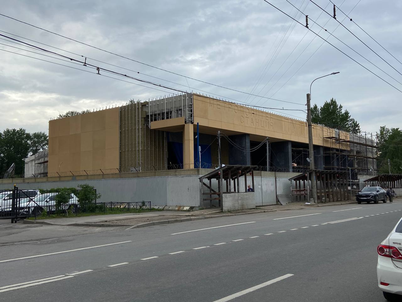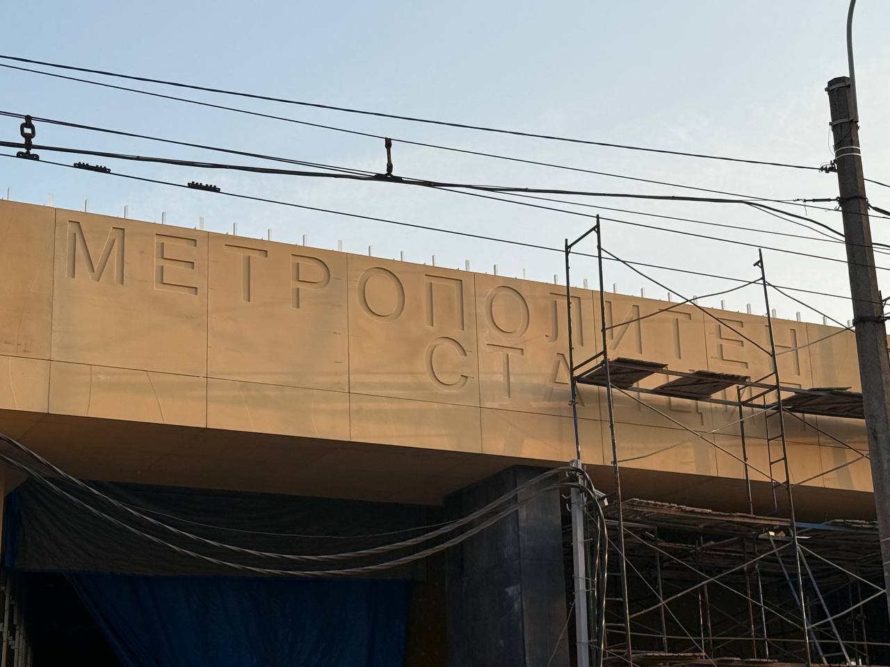 На фасад вестибюля станции «Путиловская» со стороны улицы Васи Алексеева продолжают устанавливать плиты с названием станции и надписью «Петербургский метрополитен».