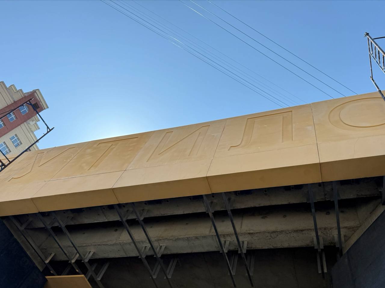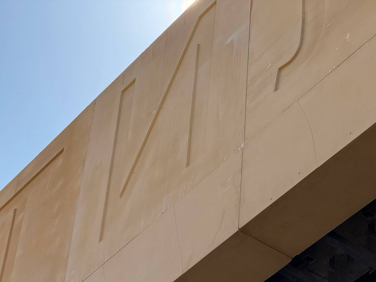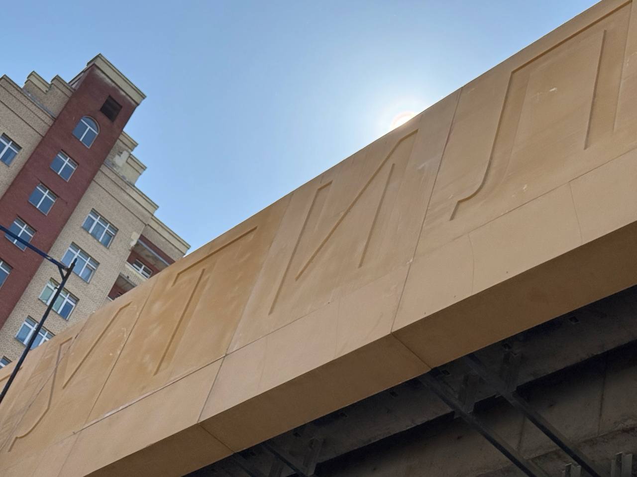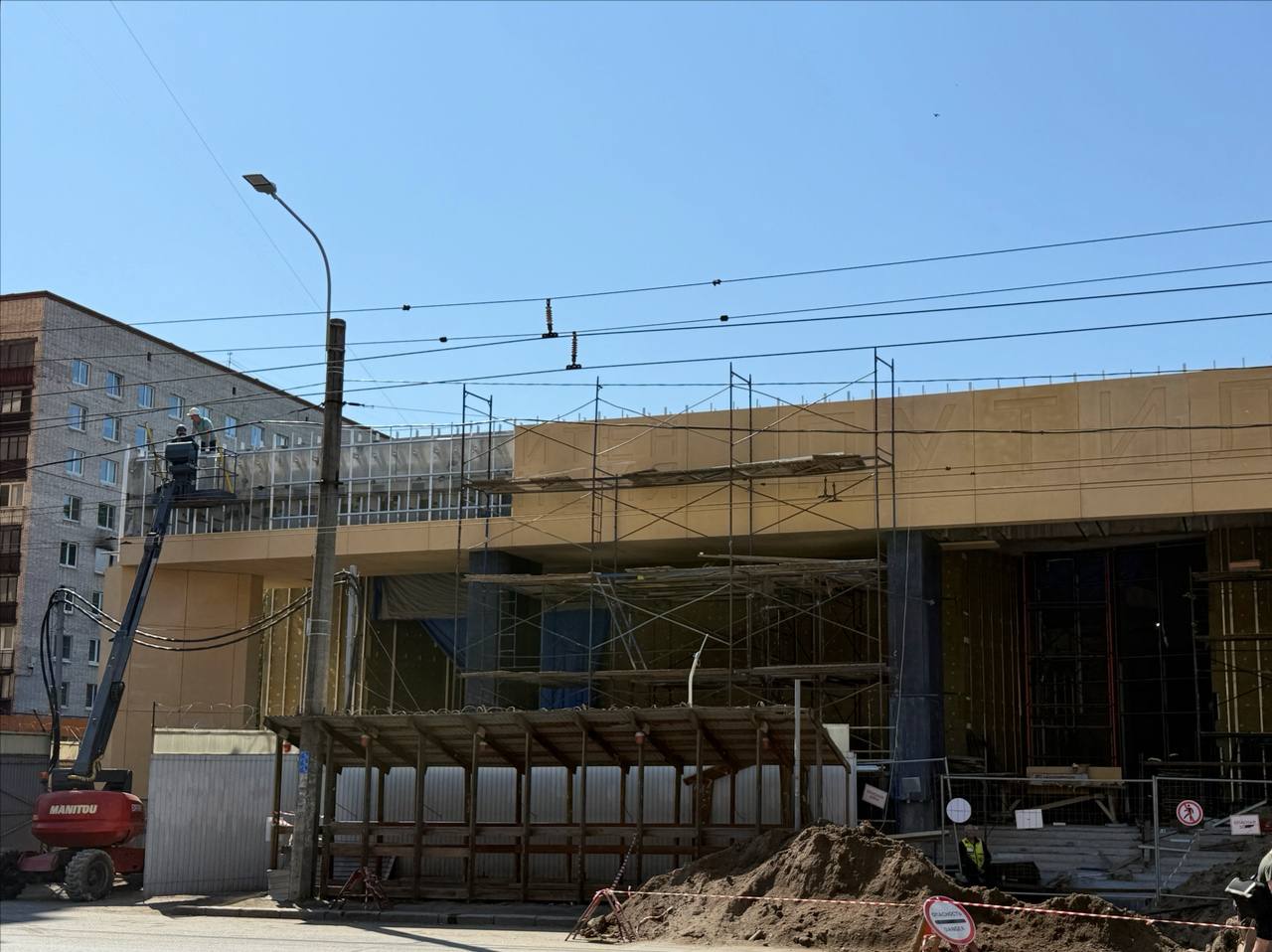 Со стороны улицы Васи Алексеева идёт монтаж архитектурных элементов из стеклофибробетона песочного цвета на антаблемент, а также элементов темно-серого цвета на колонны.