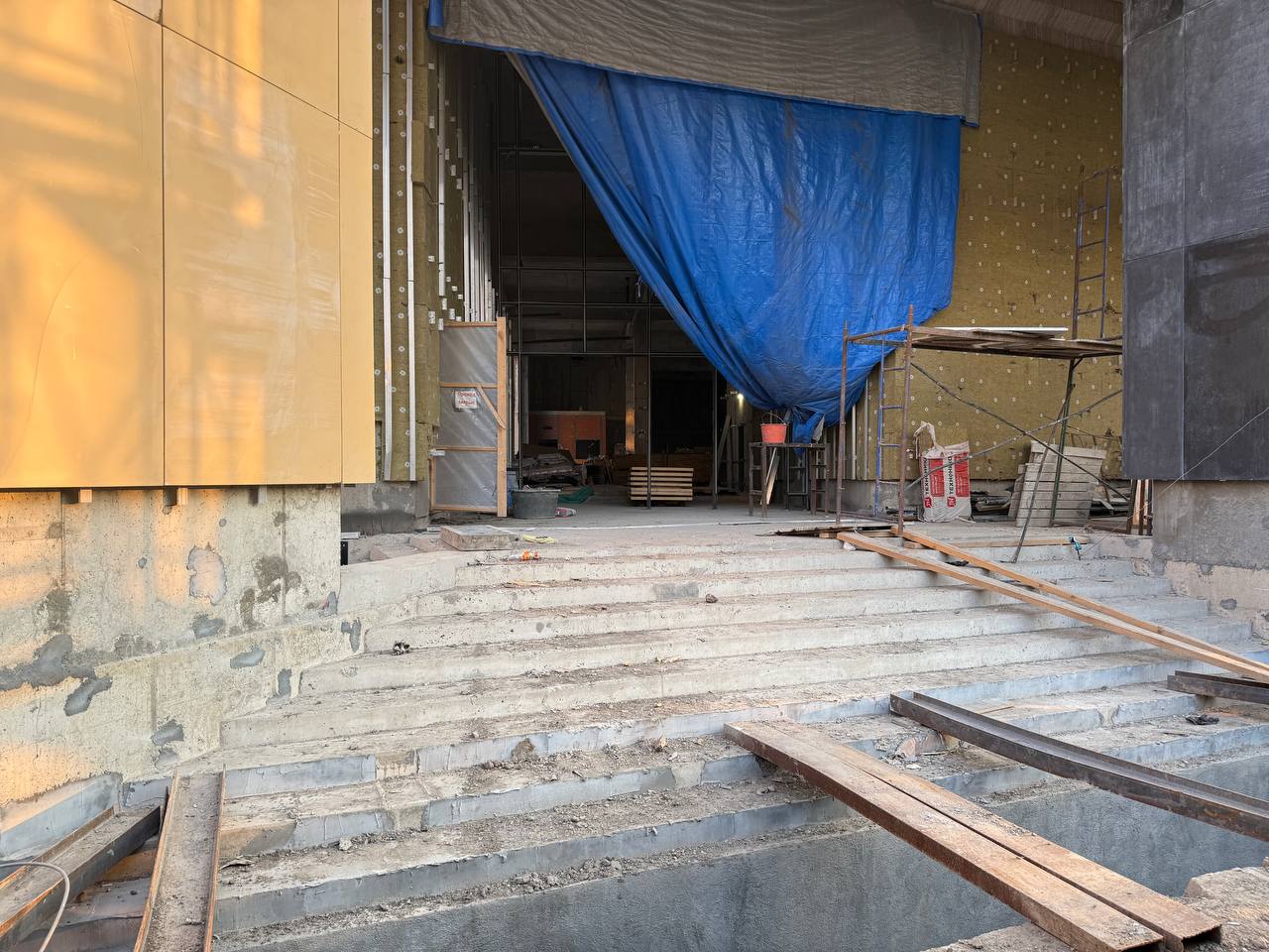 Помимо этого продолжается монтаж подсистемы для стеклянной части фасада. В проемах кассового зала монтируется стоечно-ригельная система будущих витражных окон.