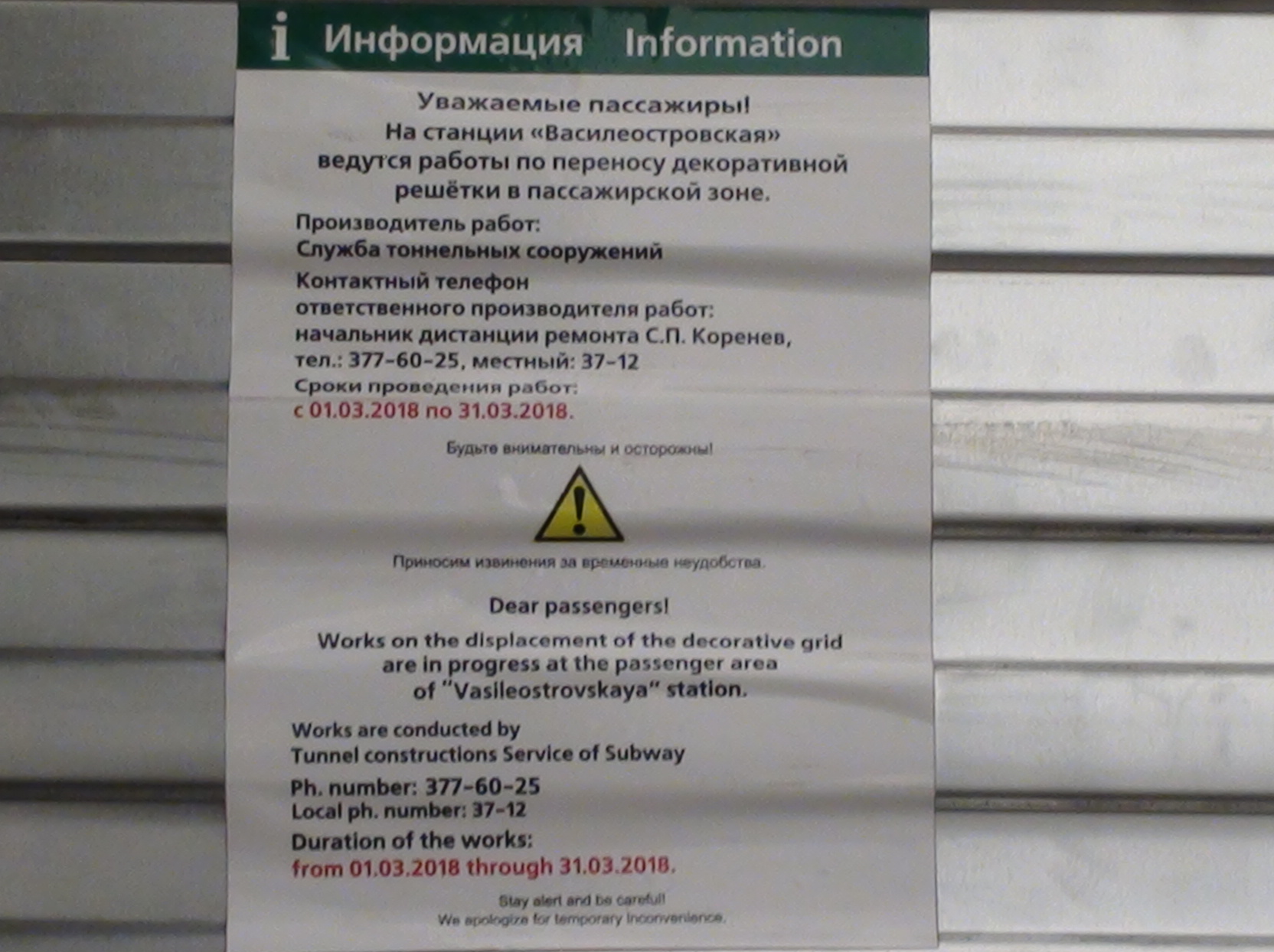 Недавно на «Василеостровской» начались «работы по переносу декоративной решетки», сопряженной с демонтажем помещений в торце. Выполняет подряд сам Петербургский метрополитен в лице службы тоннельных сооружений. Официальный представитель подземки сегодня сообщил «Канонеру», что после модернизации площадь, необходимая оборудованию блокпоста, сократилась, а потому больше нет необходимости закрывать двери поездов. Демонтаж стенки потребовался в связи с тем, что 3-я линия метро будет обслуживать стадион на Крестовском острове во время чемпионата мира по футболу, заметил собеседник интернет-издания.
