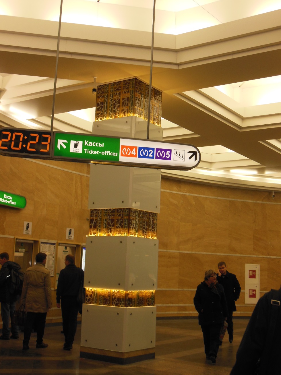 На эскалаторе удивили фиолетовые цилиндры на светильниках - когда я их увидел на Адмиралтейской, то подумал, что они оригинальны и сделаны специально "под цвет линии", но здесь-то они должны были бы быть оранжевыми - нет, опять фиолетовые. То есть, цвет линии они не отображают. Тогда зачем они вообще нужны?