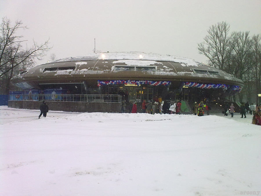 Замечательно смотрится задняя часть вестибюля, что скрывается за синим забором и новогодними банерами.