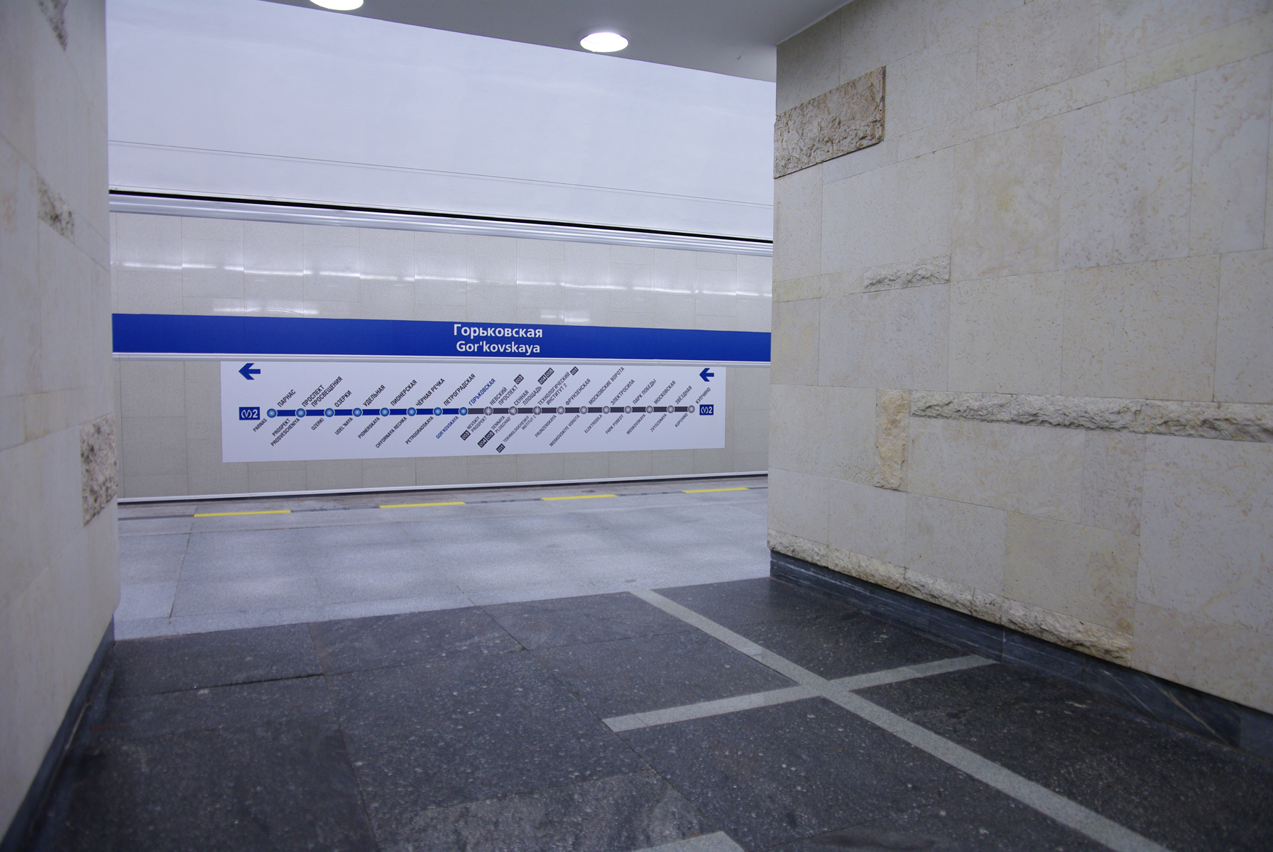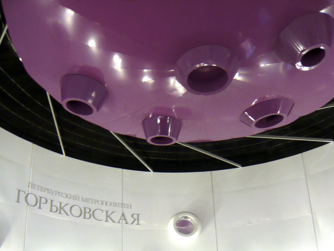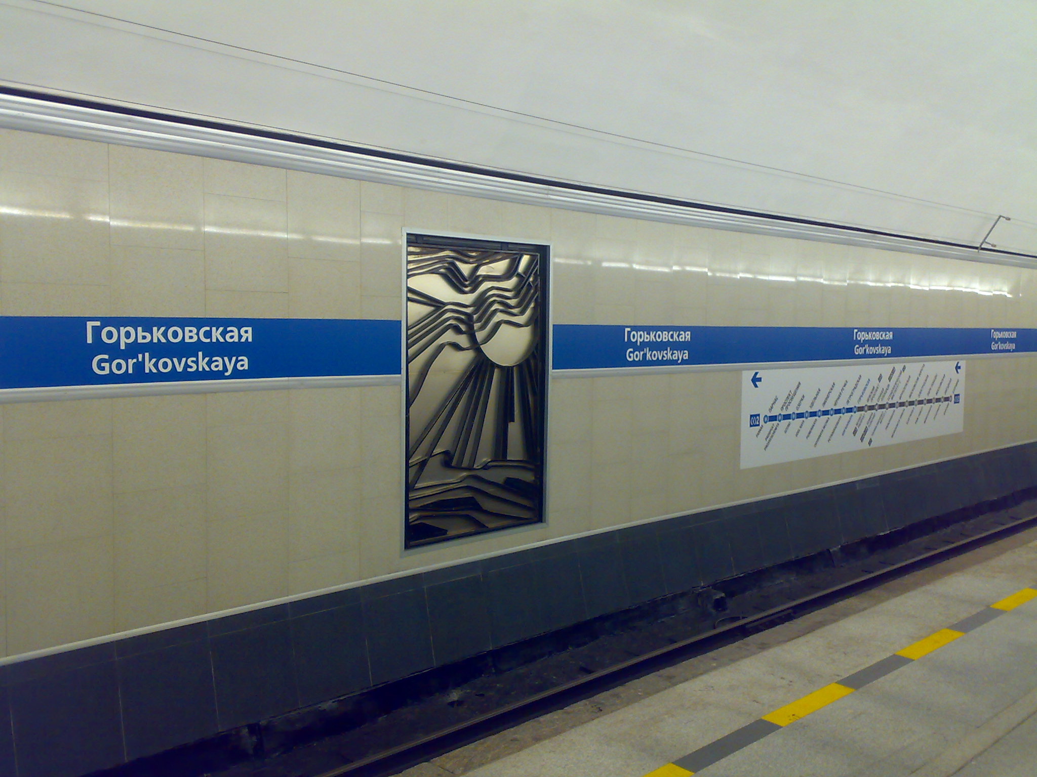 станция ну очень не понравилась. особенно вестибюль. летающая тарелка, как оказалось, превратилась в коровью лепёшку (верх здания почему-то коричневый), вымя собрано отвратительно, а на кой лях оставили пространство вокруг него не закрытым, а только поставили решётки - вообще мне не понятно. в общем, мне показалось, что проект вестибюля делал пациент псих больницы на Матисовом острове. ну и выше сказали, что цвет стен стилизован под коровью шкуру. в общем, название - Горьковская, силуэт - летающая тарелка, суть - молокозавод.