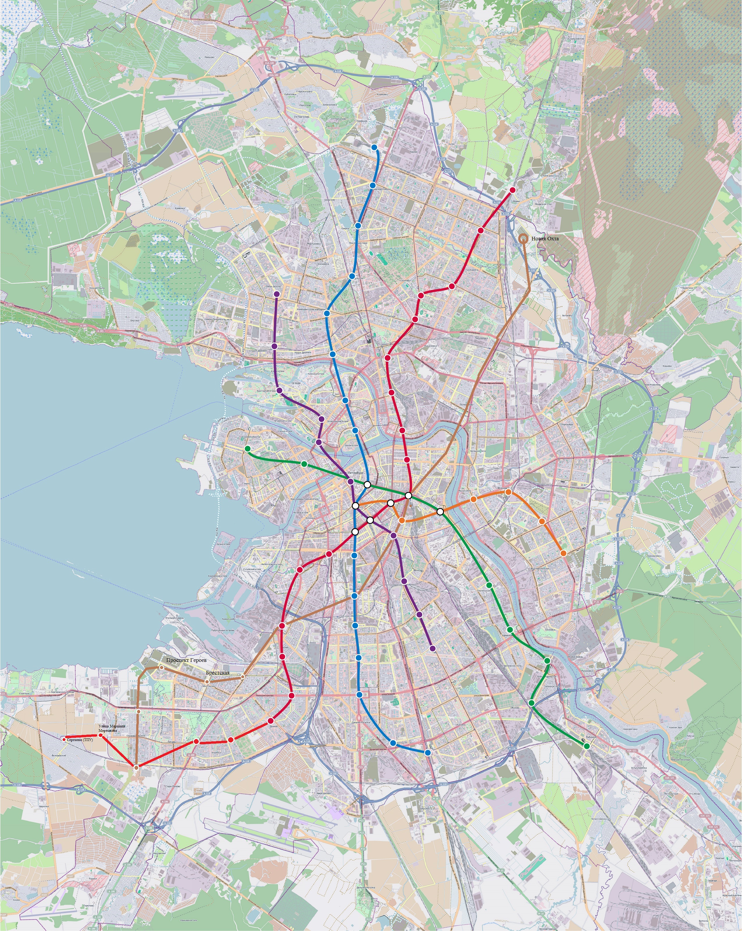 На схеме показана только ККЛ линия в её проектном виде с изменением на юго-западе. Так мне кажется логичнее. И на Северо-востоке продление до Новой Охты. Первая линия продлить до Сергиево с пересадкой на Сосновой поляне.