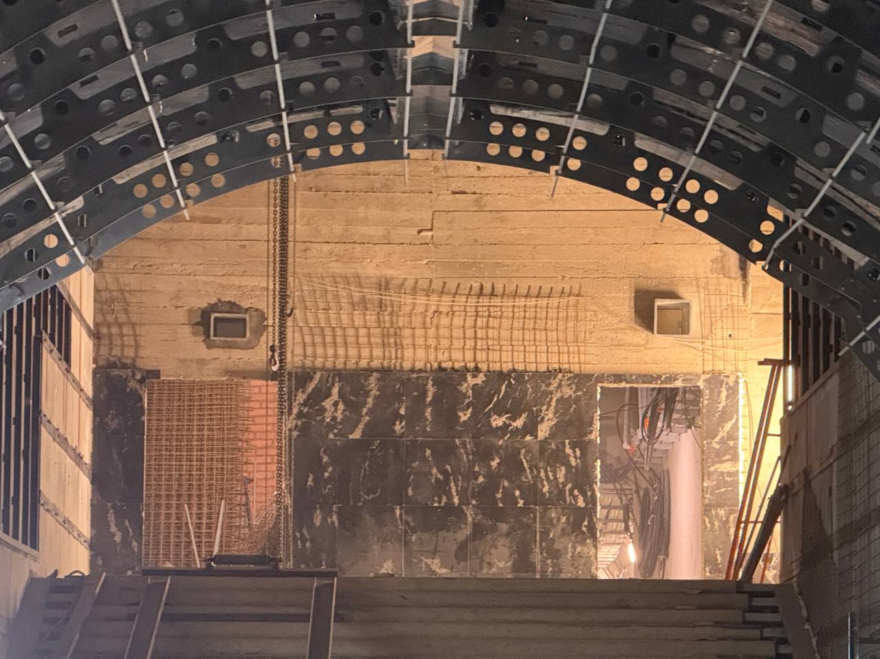 Чтобы разломать торцевую стену поперечной камеры и соединить пересадочный узел со станцией "Кировский завод" внутри камеры прежде была забетонирована новая стена.