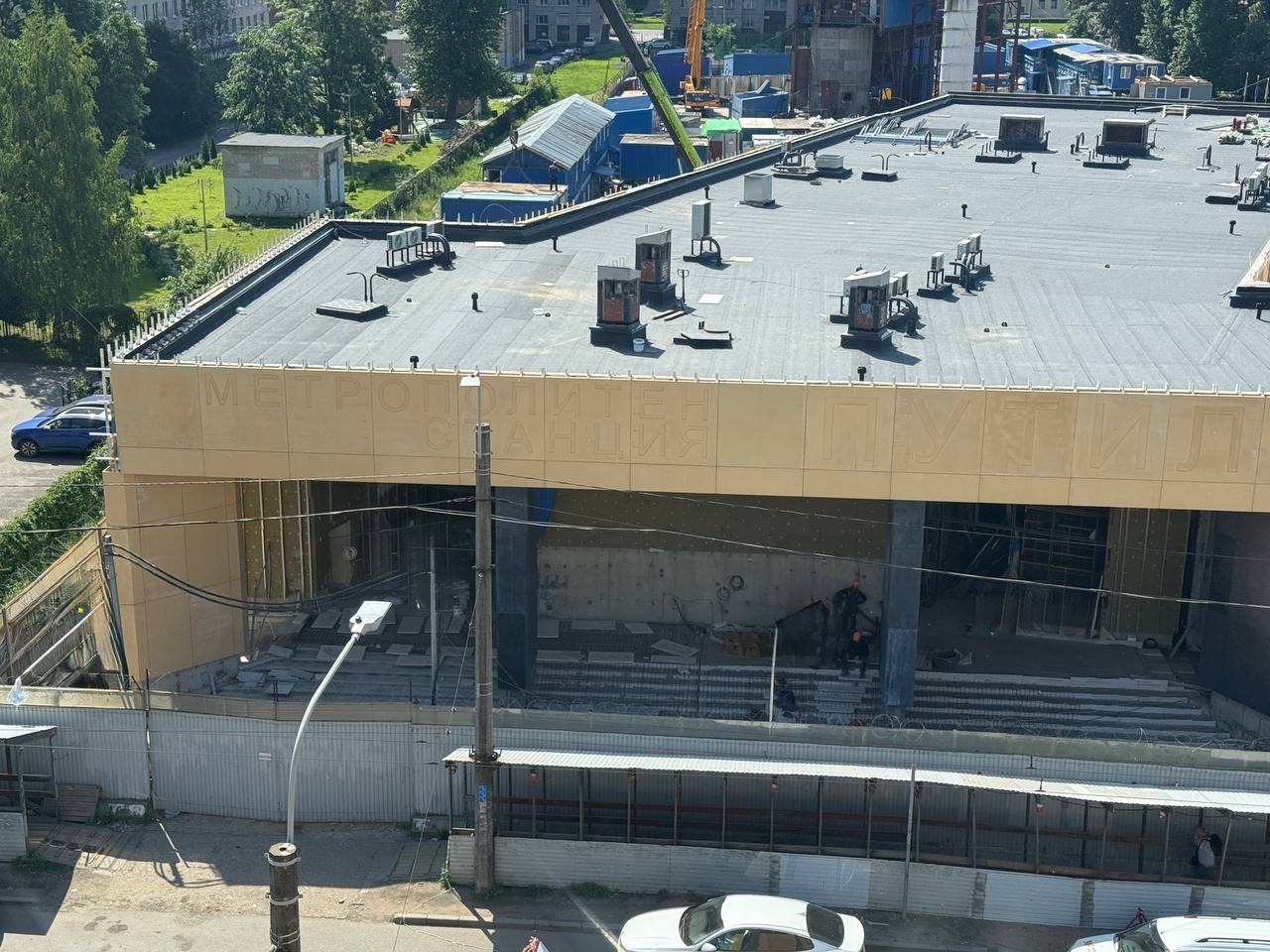 На строительстве вестибюля станции «Путиловская» Красносельско-Калининской линии Петербургского метрополитена приступили к укладке гранитных плит на лестницу перед входом.